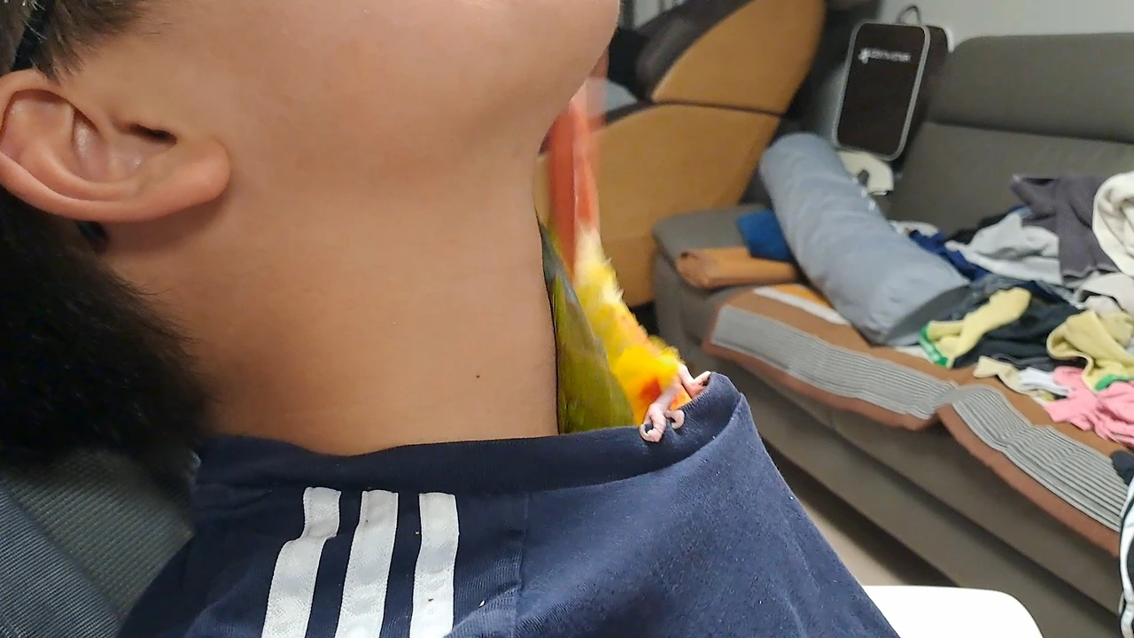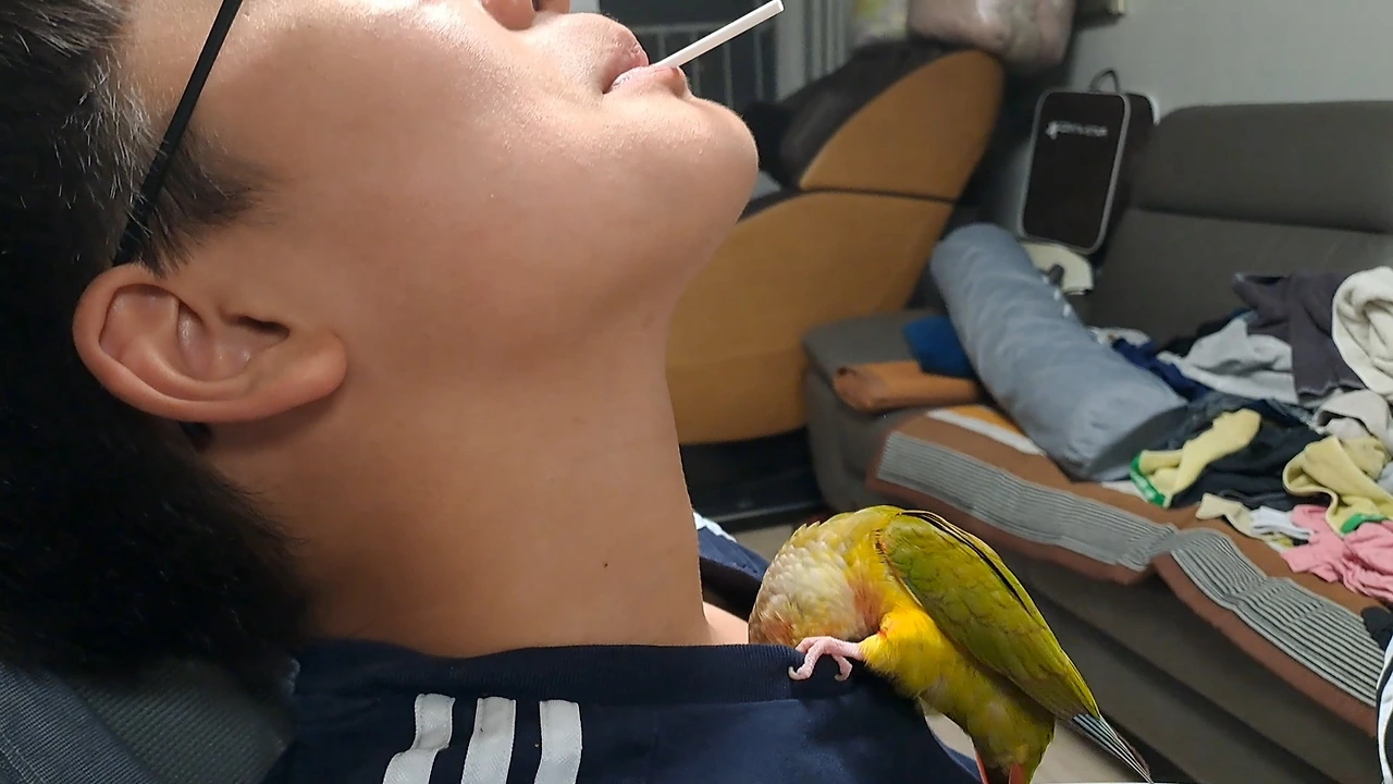 오빠가 먹는 사탕이 무지 맛있어 보였는지 사탕 막대기에 집착한다. 달콤한 냄새가 살살 퍼지니 새 코가 반응한 것이다. 좌우로 왔다 갔다 하며 어떻게든 한 입 먹고 싶어 안달복달했지만, 끝까지 오빠가 주지 않자 삐졌는지 목덜미로 들어가 버린다. 앵순이가 하고 싶은 건 모두 해주고 싶지만 못 먹는 음식을 먹고 싶어 할 때는 난감하다. 사랑하기 때문에 원하는 대로 다 해줄 수 없는 마음이 이런 것이다.