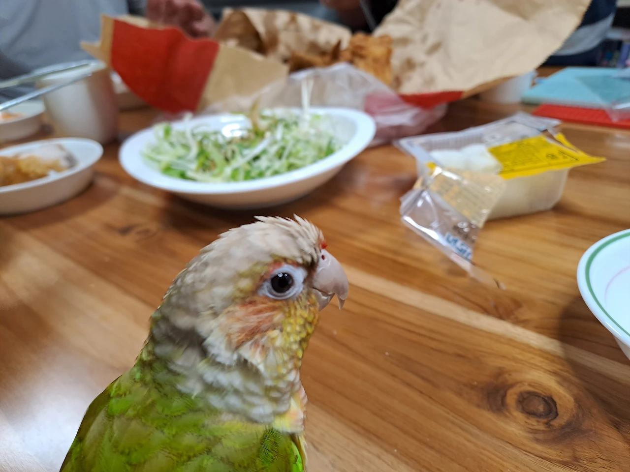 맛있는 음식 냄새가 진동하는 식탁에서 항상 왕따 당하는 앵순이는 집사들을 원망할지도 모르겠다. 사람 먹는 음식은 염분이 있고 익힌 음식이기 때문에 새 건강에 좋지 않아 줄 수가 없다. 특히 밥풀을 매우 좋아하는데 쌀 한 톨이면 세상에서 가장 행복한 앵무새가 되는데 줄 수 없다는 것이 마음 아프다.
