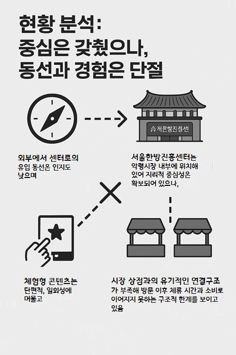 서울한방진흥센터는 약령시장 내부에 위치해 있어 지리적 중심성은 확보되어 있으나,