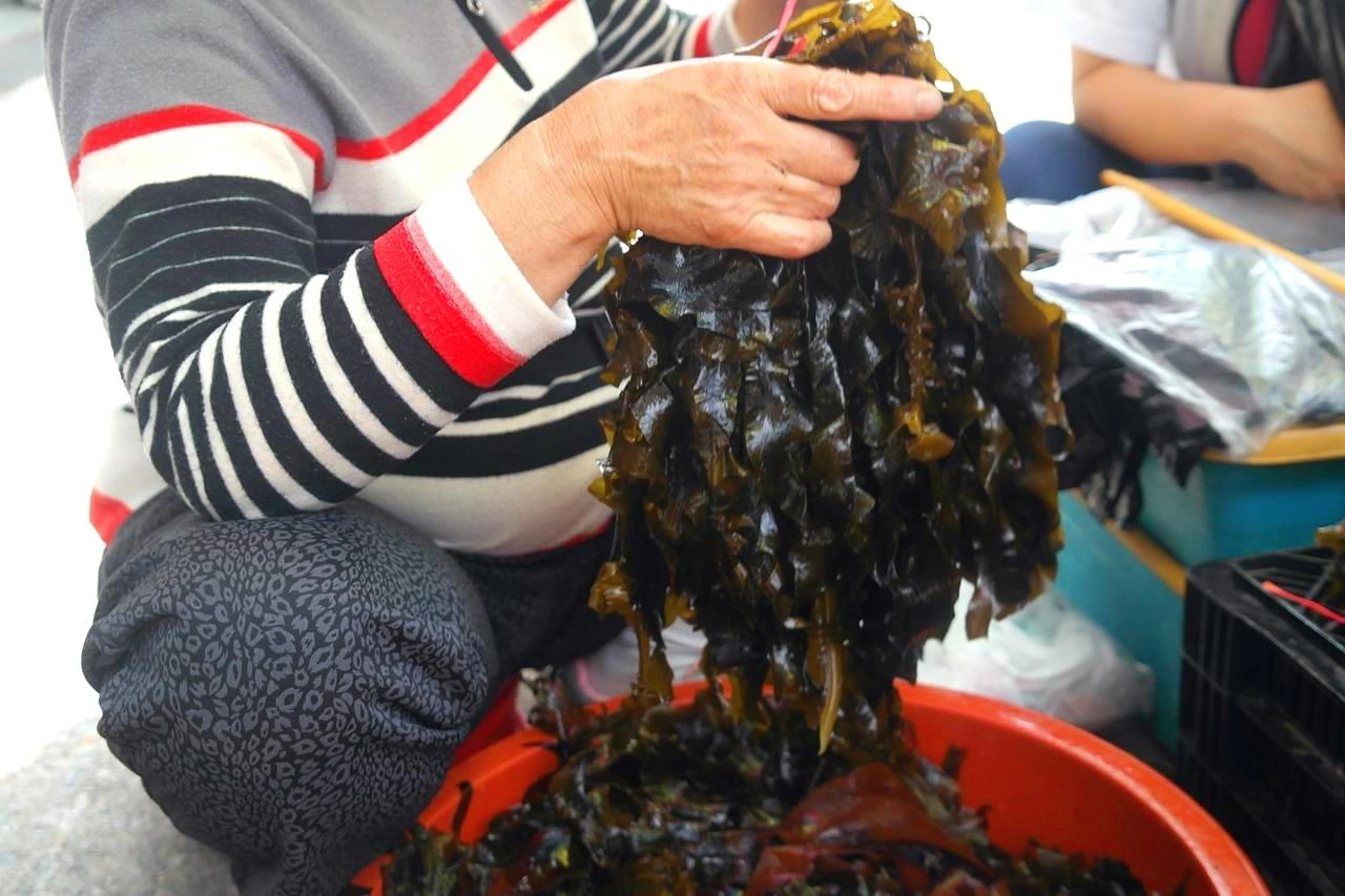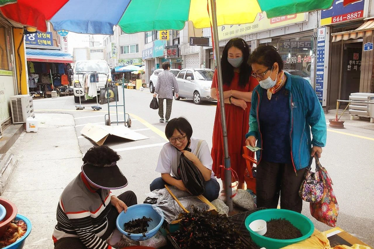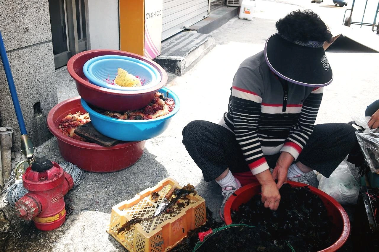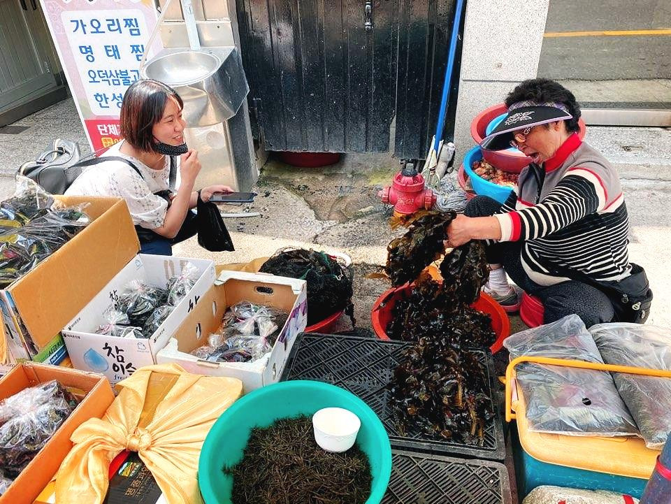 관심을 가지니 보이기 시작하는 지누아리.저마다 지누아리에 대한 추억담 하나씩은 품고 있었다. 지누아리로 이야기의 물꼬를 트는 그 자체로 기쁨이었다. 이어 초코 님의 어머니가 아는 해녀 상인을 찾아 나섰다. 그를 찾는 게 쉽지 않았다. 결국 상인 분들에게 물어물어 그를 찾을 수 있었다. 골목골목을 지나 미역을 손질하는 분을 발견했다. 어쩐지 우리가 찾는 그 사람일 것만 같은 느낌적인 느낌이다. 느낌은 예상적중이다.