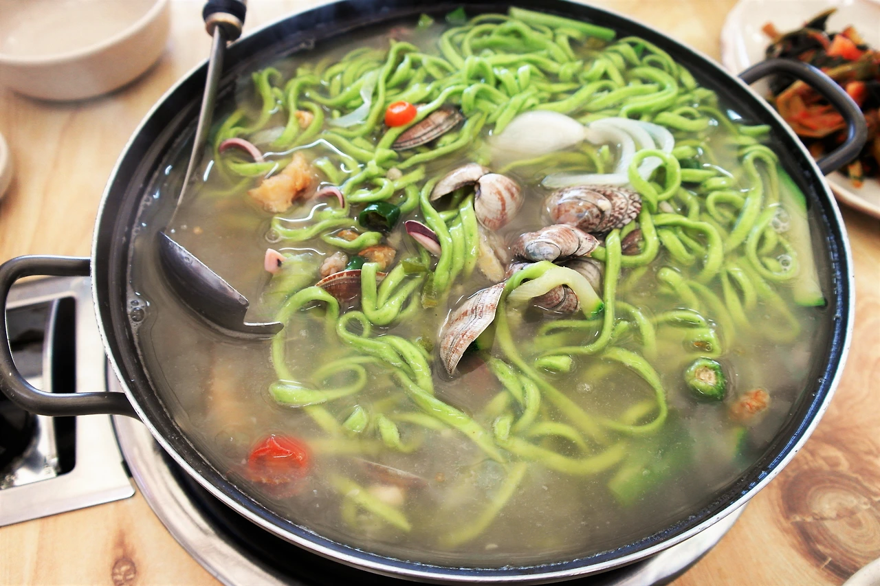 안섬포구에 가면 해물칼국수 포장마차가 거리를 이룬다. 갯벌포장마차는 첫 번째 포장마차다. 시금치 해물칼국수라 면이 초록색이다. 쫄깃쫄깃한 면발은 물론 깔끔하고 개운한 국물 맛이 일품이다. 다 먹을 수 있을까 싶을 만큼 양이 푸짐하다.