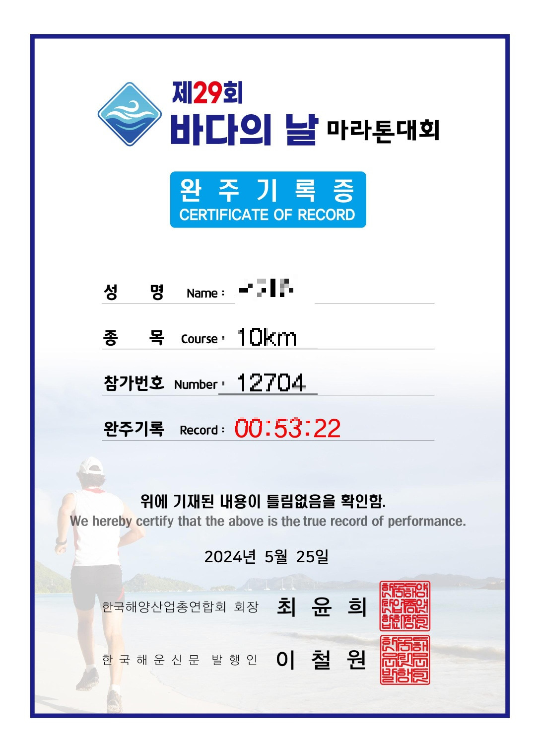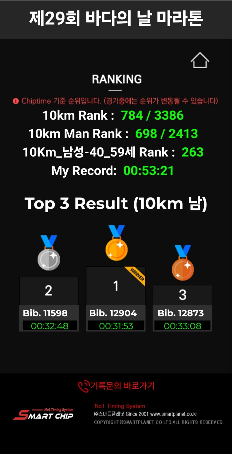 제29회 바다의 날 기념 마라톤 대회 공식 10km 완주 기록증을 모바일로 받을 수 있다.(맨 왼쪽). 가운데와 오른쪽은 마이크로칩을 통해 기록된 내 기록과 순위.
