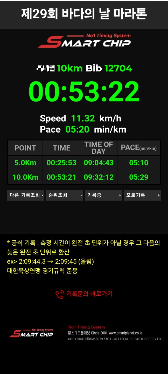 10km를 완주하면 대회 주최 측에서 마이크로칩으로 측정된 공식 기록을 확인할 수 있는 링크를 문자로 보내줬다. 내 첫 마라톤 대회 기록은 53분 22초, 속도는 11.31km/h, km당 평균 5분 20초 페이스로 달렸다. 순위는 10km 3386명 중에 784등이었다. 10km 남자 2413명 중 698번째였다. (대회전 신청은 4088명 참가였는데, 대회 당일 700명가량이 줄었다.) 그래도 한 시간 내에만 달리자 했는데, 53분이라는 내 인생 최고 기록을 세웠다. 나의 달리기를 증명하는 공식적인 숫자가 생겼다. 다음번에 달린다면 50분의 벽을 깨고 싶다는 욕심이 생겼다.
