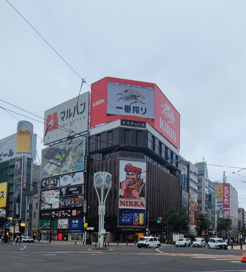 삿포로시의 대표적인 번화가 스스키노역의 상점가. 스스키노역 사거리의 니카(NIKKA)상은 기념촬영 필수코스다.
