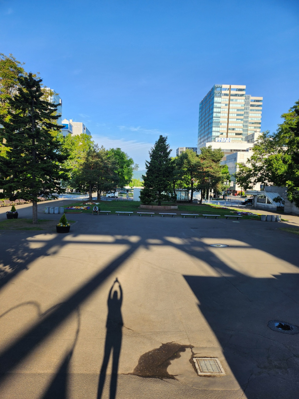 일단 삿포로 TV 타워 앞 계단에 올라가서 오도리공원 사진을 찍었다. 확실히 전망대 위에서 찍은 것처럼 공원 전체가 조망되는 그림이 나오지 않았다. 다만 강렬한 홋카이도의 햇살이 공원을 환하게 비추고 있었다. 아까 지나갈 때 벤치에 삼삼오오 모여있던 젊은 이들의 그룹은 어느새 흩어져 버렸다. 그리고 멀리서 오도리 공원을 달리는 러너들이 보였다.