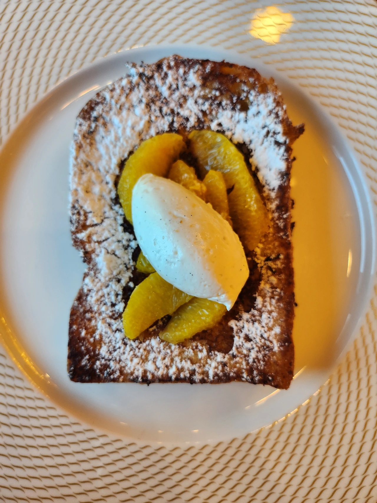 그다음은 프렌치토스트. 프렌치토스트는 설탕과 시럽의 맛이지. 구운 식빵에 설탕 가루와 오렌지 등을 올렸다. 그리고 그 위에 시럽을 뿌렸다. 프렌치토스트 특유의 맛이 느껴졌다.