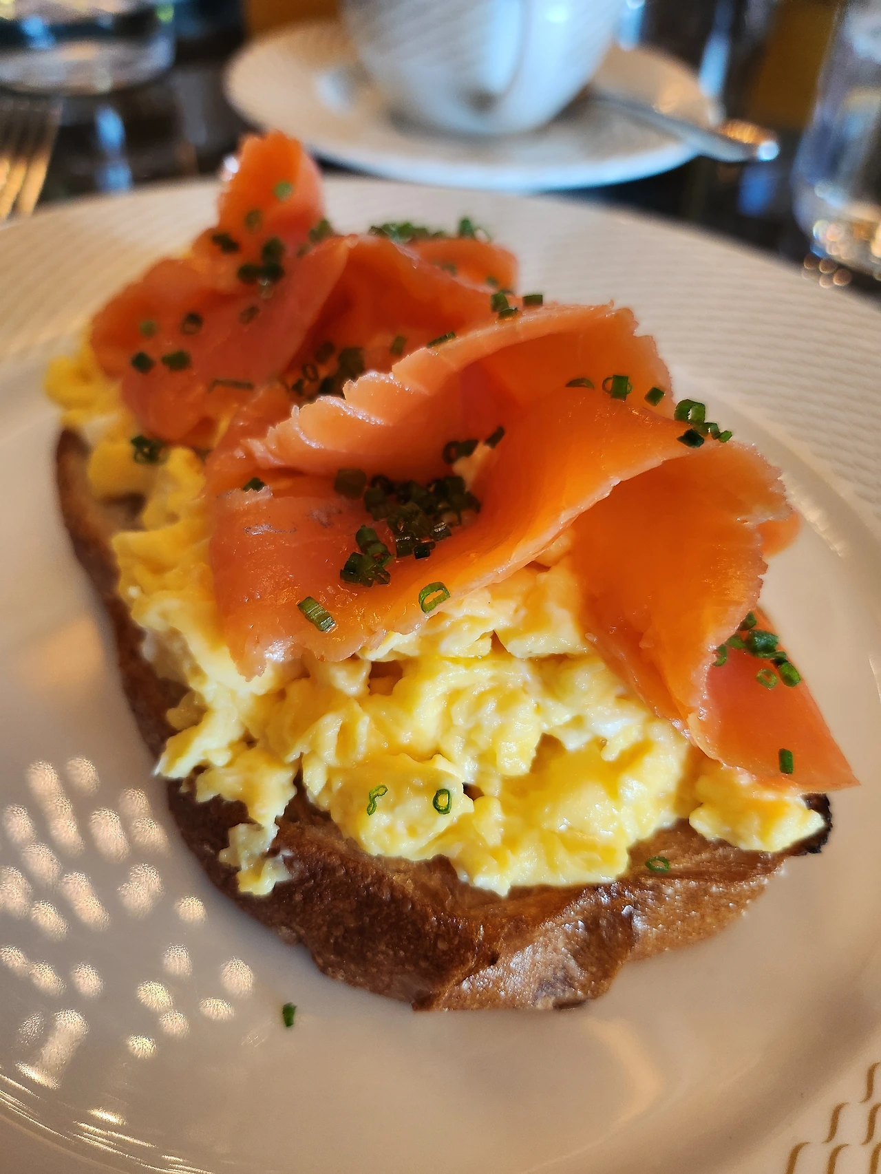 그래서 나온 훈제 연어 샌드위치! 빵 위에 에그스크램블, 그리고 그 위에 훈제 연어가 얹혔다.