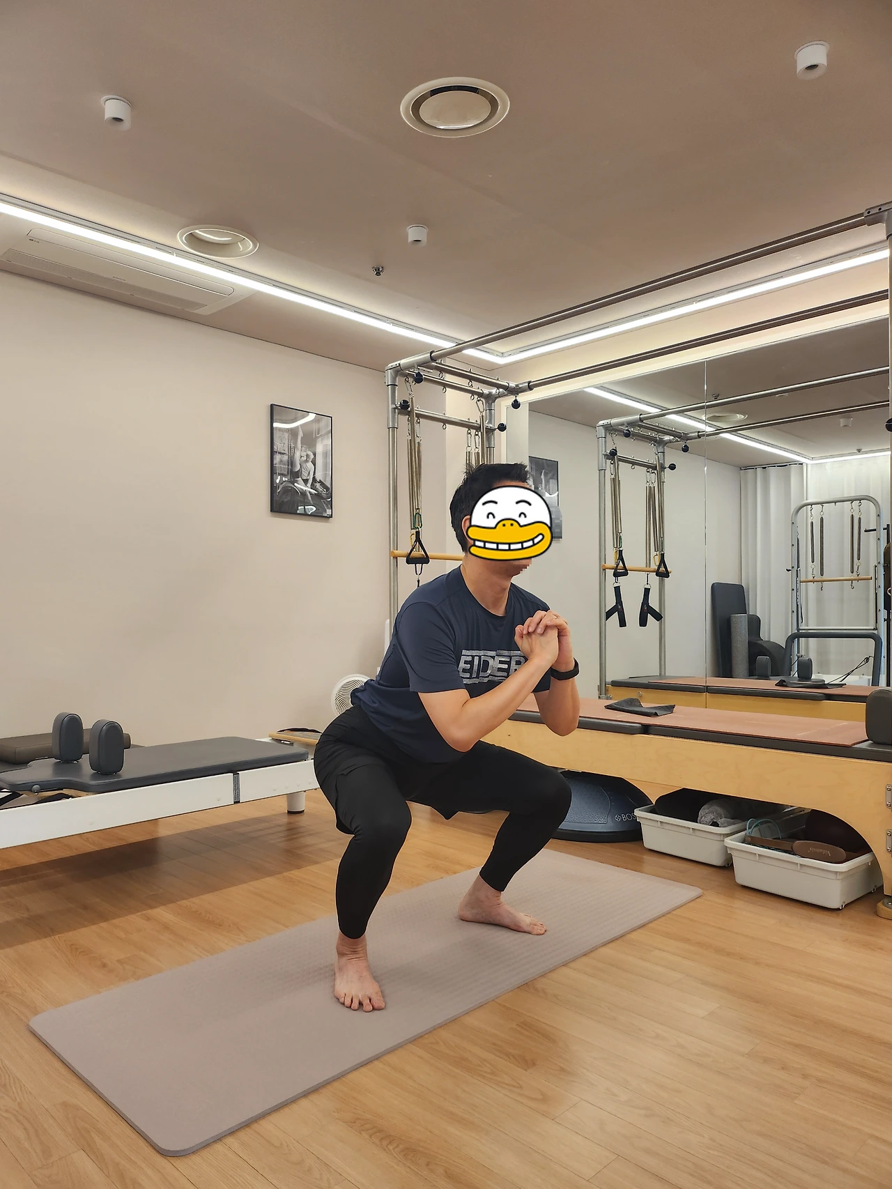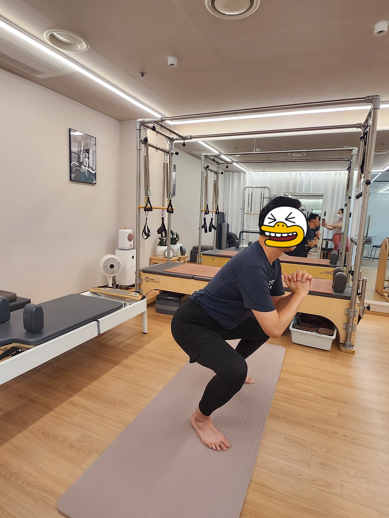 모임(Moim) 필라테스의 LS 원장님은 스쿼트를 10회 시키면 8회부터는 내려가서 3초~5초 버텼다가 일어서게 한다. 그리고 마지막 10회 때는 앉은 자세에서 양 발목을 세워 발목을 세우는 까치발 자세를 만드는 동작을 5회 가미한다. 그리고 일어선다.