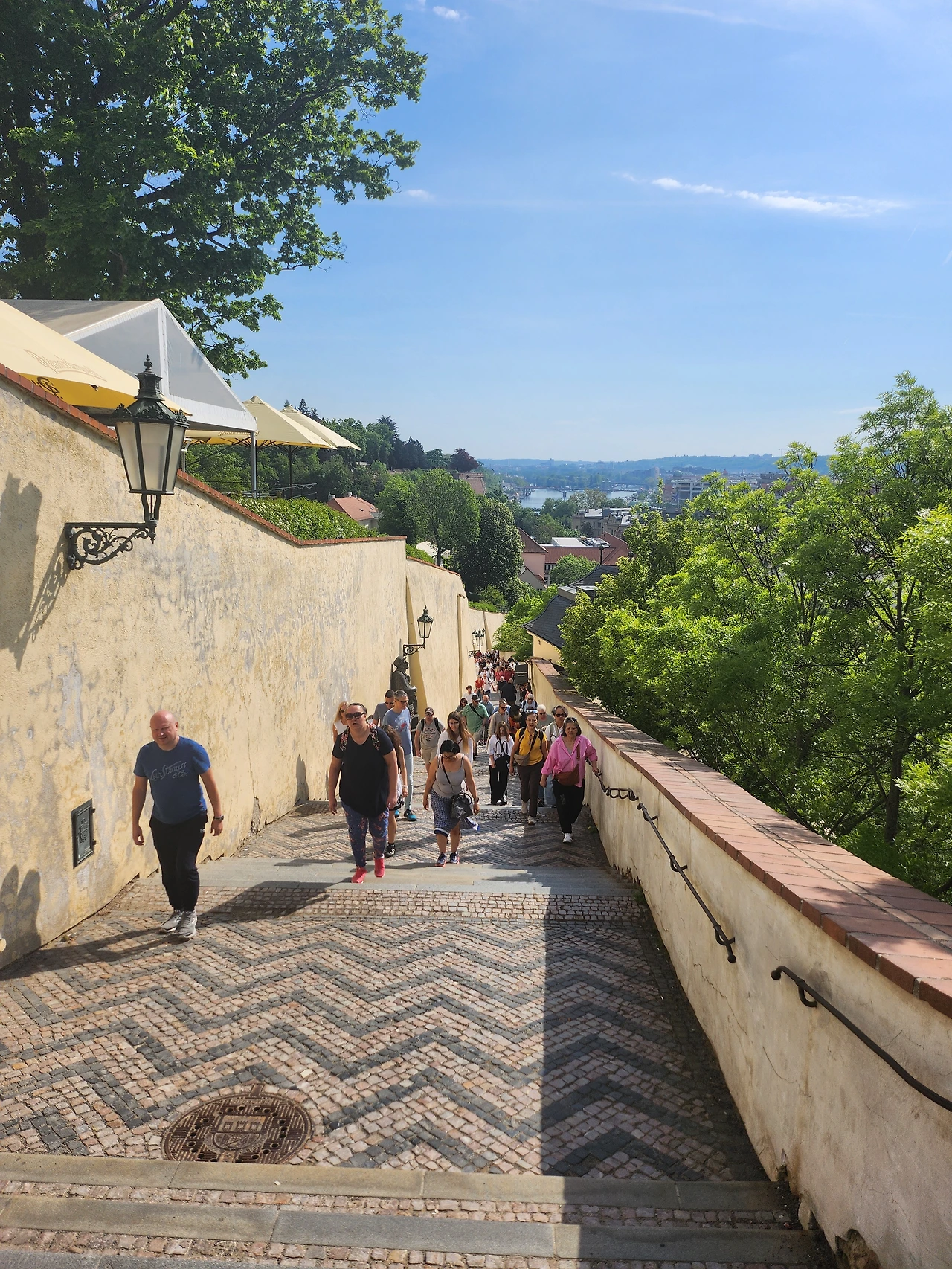카를교를 지나면 눈앞에 긴 언덕길이 펼쳐져 있다. 이 길을 따라 각종 기념품 샾 등이 늘어서 있다. 모스테츠카에서 말로스트란스케 나므네스키 길까지 이어진다. 거리는 400m지만 높이가 14m다. 여기서 좌측으로 돌아 고급 주택들이 늘어서있는 네루도바 길을 따라간다. 이 길은 경사가 54m로 보폭을 줄여 페이스 조절을 해야 할 것 같다. 길을 따라 800m를 달리면 프라하성문 앞 흐라드찬스케 광장에 도착한다.
