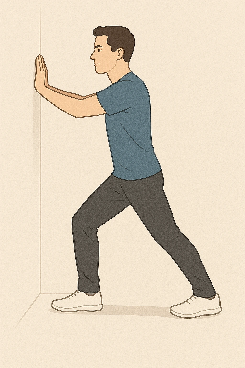 아킬레스건을 늘리는 스트레칭. 상체로 벽을 밀면서 뒷 다리 근육을 늘린다.(챗GPT)