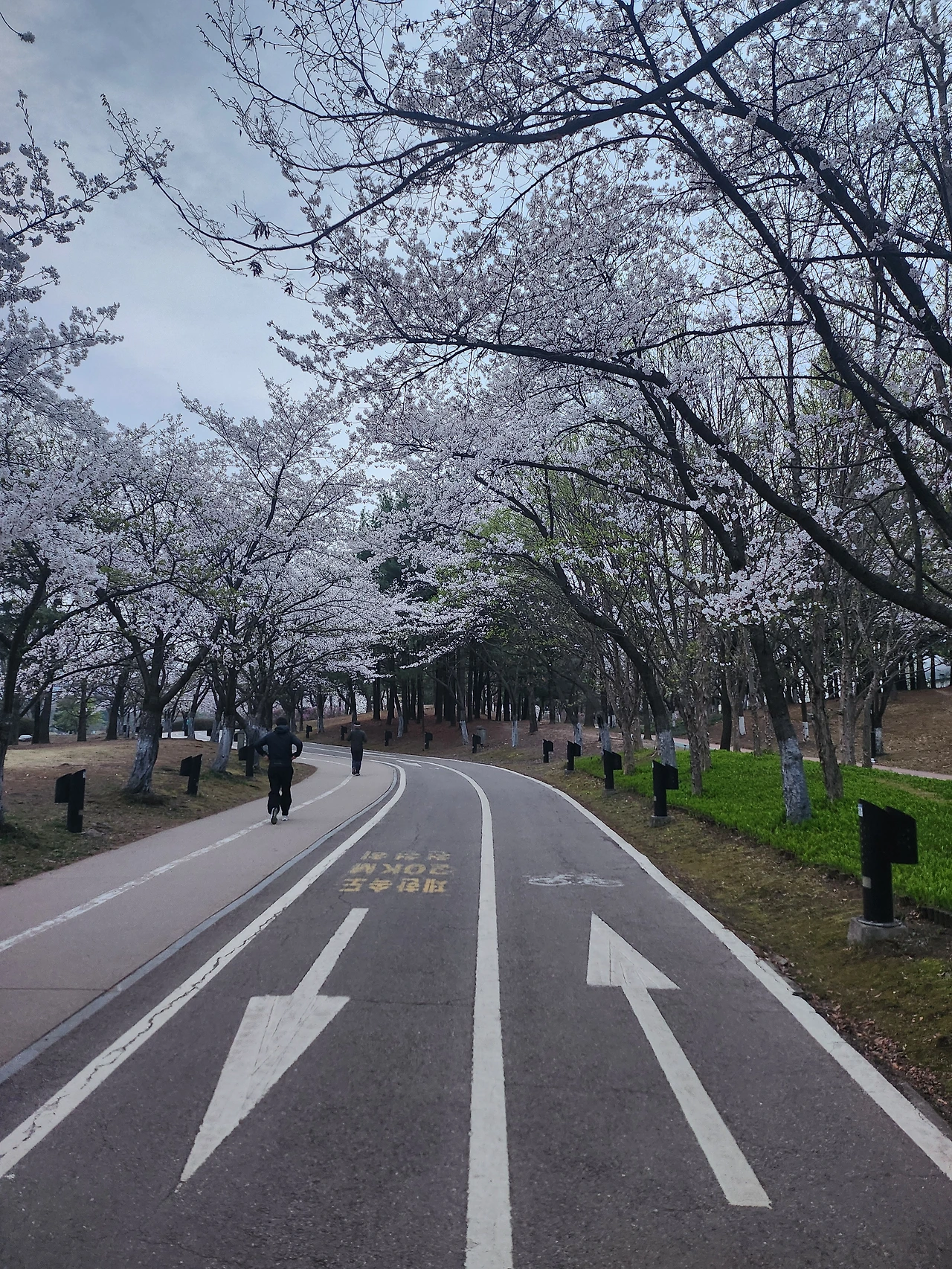 좀 더 달려 2.9km 표지판을 지나면 호수교가 나온다. 그 애수교를 지나면 얕은 언덕길이 나오는데, 벚꽃 시즌에 벚꽃이 만발한 그 길이 그렇게 이쁘다. 일명 벚꽃 맛집. 여기가 두 번째 스폿이다.
