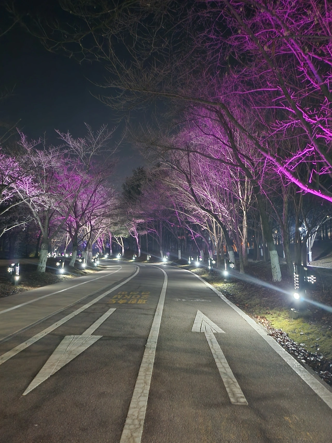 호수공원을 반시계 방향으로 돌면서도 두 군데 스폿을 정했다. 0.9km 표지판을 지나 호수교 언덕에 못 미치는 지점이다. 날이 어두울 때 가로수 나무들 밑에 설치된 조명이 파란색, 보라색, 붉은색, 초록색으로 빛나며 몽환적인 분위기를 연출한다. 으시시하면서도 이색적인 길이다.