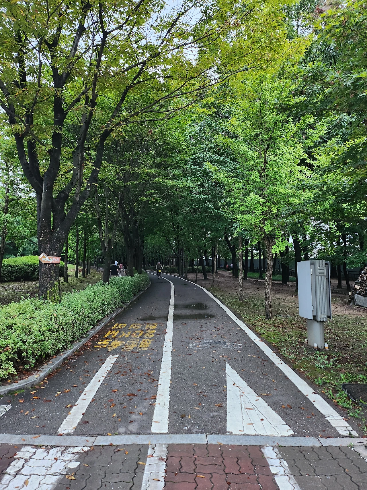 우선 호수공원을 시계 방향으로 달릴 때 1.9km 표지판을 지나 500m 정도 더 달리면, 내가 달리는 자전거 도로 양 옆으로 가로수 나무들이 길게 늘어선 길이 나온다. 마치 숲으로 들어가는 문 같았다. 여름에는 만개한 푸른 나뭇잎이 천정을 만들어 동굴로 가는 느낌이 들었다. 마치 동화책 이상한 나라의 앨리스의 이상한 나라로 들어가는 묘한 기분이 들어 좋았다.
