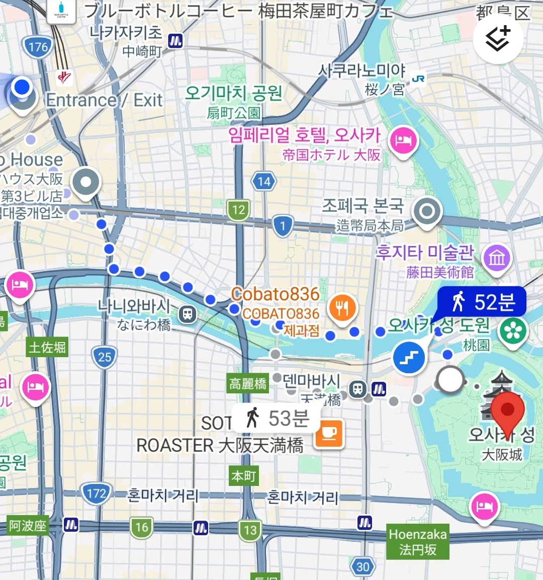 문제는 숙소에서 오사카성까지 어떻게 가느냐다. 숙소인 '호텔 한규레스파이어호텔(Hankyu Refire)'은 우메다 지역에 위치해 있다. 구글맵으로 숙소에서 오사카성까지 거리를 측정했더니, 약 4km가 나왔다. 오사카성 공원 산책로는 짧은 코스 2.9km, 긴 코스 3.5km다. 호텔에서 오사카성까지 뛰어간다 치면, 가는데 4km, 짧은 코스 2.9km, 오는데 4km, 짧게 잡아도 약 11km다. 기왕 오사카까지 왔는데, 짧은 코스, 긴 코스 다 달려보고 싶었다.