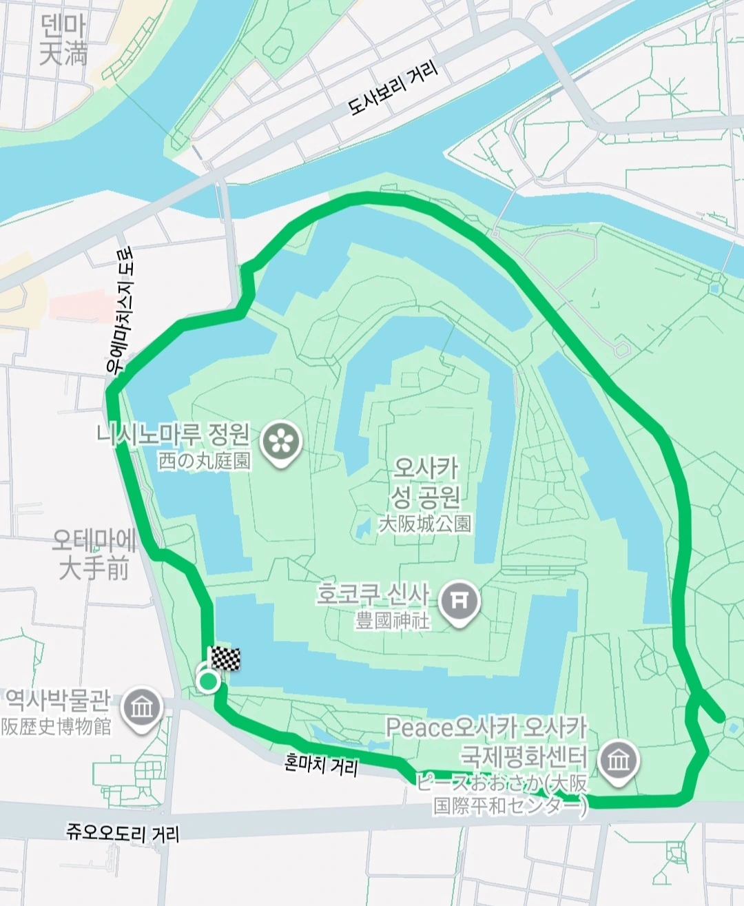 짧은 코스를 돌고, 긴 코스를 돌았더니 마지막에는 힘이 부쳤다. 그래도 다행인 것은 길만 잘 따라가면 이정표가 잘 되어 있어 스마트폰을 꺼낼 필요가 없어 좋았다. 오사카성 공원 코스는 전체적으로 쾌적했다. 긴 코스와 짧은 코스 길이 넓은 편이었다. 게다가 새벽이어서 인파가 없어 쾌적하게 달렸다.