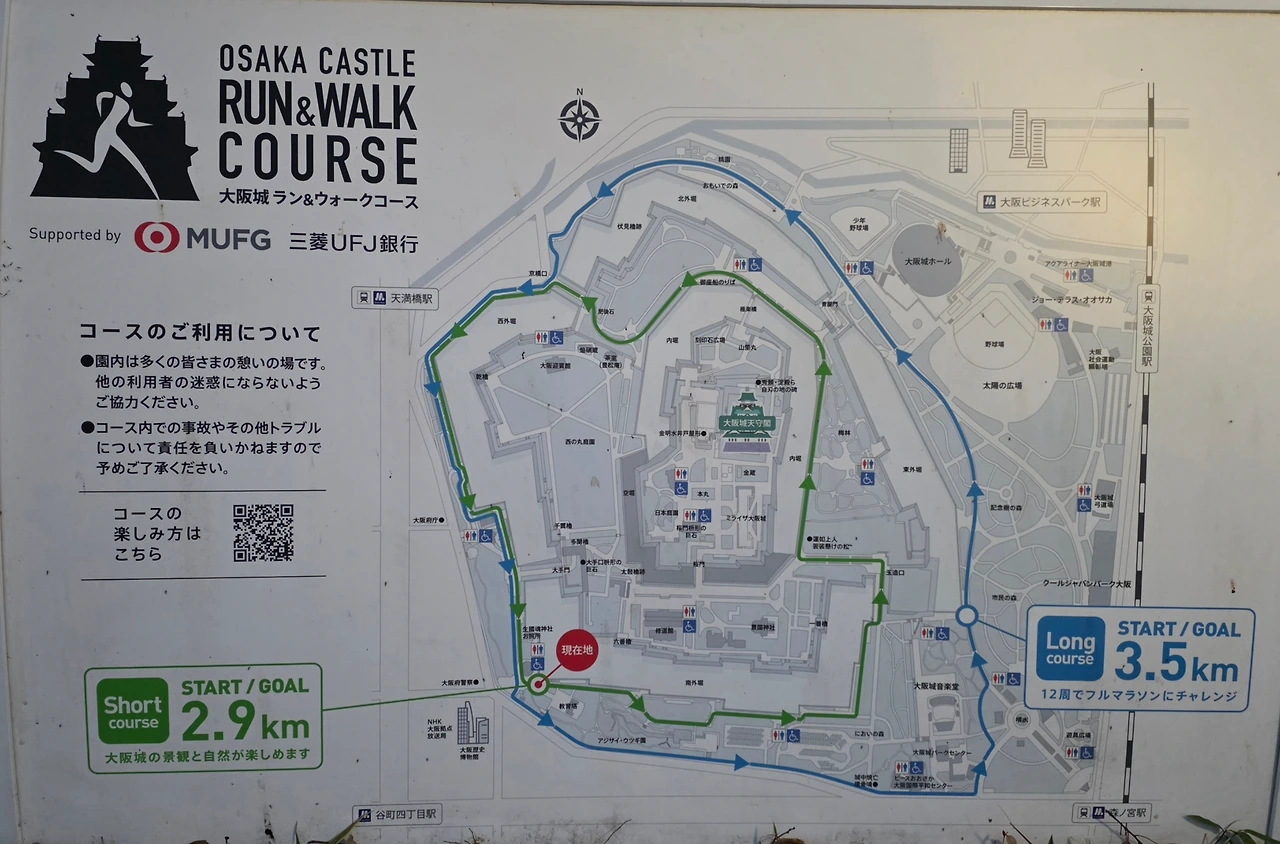 러너들을 따라가니 금방 오사카성 공원에 도착했다. 공원 입구에 산책로 지도가 세워져 있었다. 블로그에서나 보던 그 지도다. 오사카성 산책로는 '짧은 코스(Short Course)'와 '긴 코스(Long Course)' 두 개가 있었다. 짧은 코스는 오사카성을 둘러싼 안쪽 해자 주변으로 도는 코스로 2.9km다. 긴 코스는 바깥 해자 밖으로 도는 코스로 3.5km다(오사카성을 보호하는 긴 연못인 해자가 안쪽, 바깥쪽 2개가 형성되어 있다). 짧은 코스를 돌고 긴 코스를 돌면 약 6km, 적당한 거리다.
