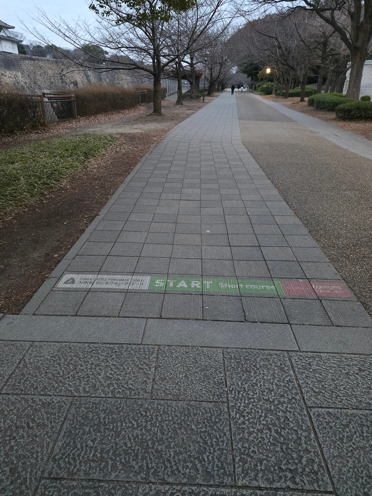 초행길이라 잠시 멈춰 서서 해자를 구경했다. 달리기도 중요하지만 오사카성의 풍경도 기억에 담고 싶었다. 옆으로 다른 러너들이 지나갔다. 관광 모드라 천천히 달렸다. 바닥에는 짧은 코스를 알려주는 이정표가 곳곳에 보였다. 그런데 아뿔싸. 짧은 코스가 오사카성을 가까이서 돌 것이라고 예상하고 천수각으로 향하는 성 안쪽통로로 들어가 버렸다. 나중에 보니 짧은 코스는 안쪽 해자 주변을 도는 코스였다. 사실 오사카성을 가까이서 보고 싶었던 마음이 컸다. 성 안쪽으로 들어가니 저 멀리서 체조를 하는 한 무리의 어르신들이 보였다. 일산호수공원에서도 자주 보던 익숙한 풍경이었다. 나라는 달라도 공통점이 있구나 싶었다. 사실 태극권인지 체조인지는 잘 모르겠다.