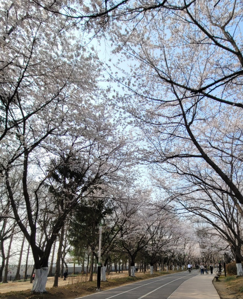 벚꽃 시즌이 되면 자전거 도로 양쪽에 늘어선 벚꽃 나무에 벚꽃이 만개해 벚꽃 길이 완성된다. 특히 새벽이나 이른 아침에 달리면, 인파 없이 그 길을 오롯이 나 혼자 즐길 수 있다. 간혹 다른 러너들이 있지만, 나 혼자 즐기는 것과 마찬가지다. 여름이면 푸른 나뭇잎이 가득한 숲길로 변한다. 봄에는 분홍빛 벚꽃 터널이라면 여름에는 나뭇잎이 우거져 초록빛 터널이 된다. 가을에는 울긋불긋한 낙엽이 하늘과 바닥을 수놓아 숲길이 불타는 것과 같다. 겨울이면 나뭇잎이 다 떨어져 뭔가 을씨년스러움을 연출하고, 눈이 오면 온통 눈으로 둘러싸인 눈길이 완성된다.