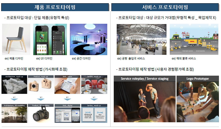 기존 제품 프로토타이핑과 경험 프로토타이핑의 차이점을 살펴보면 서비스의 4가지 속성(무형성, 동시성, 이질성, 소멸성)과 인터랙선의 복잡성으로 기존의 디자인 프로토타이핑 방법으로는 사용자 경험을 프로토타이핑 할 수 없다.