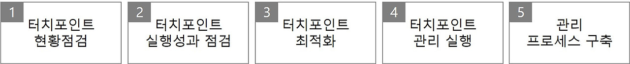 4)터치포인트 관리 실행 : 재편성된 터치포인트를 운영하기 위한 Operation Model, Manual 등을 개발하여 제공합니다.