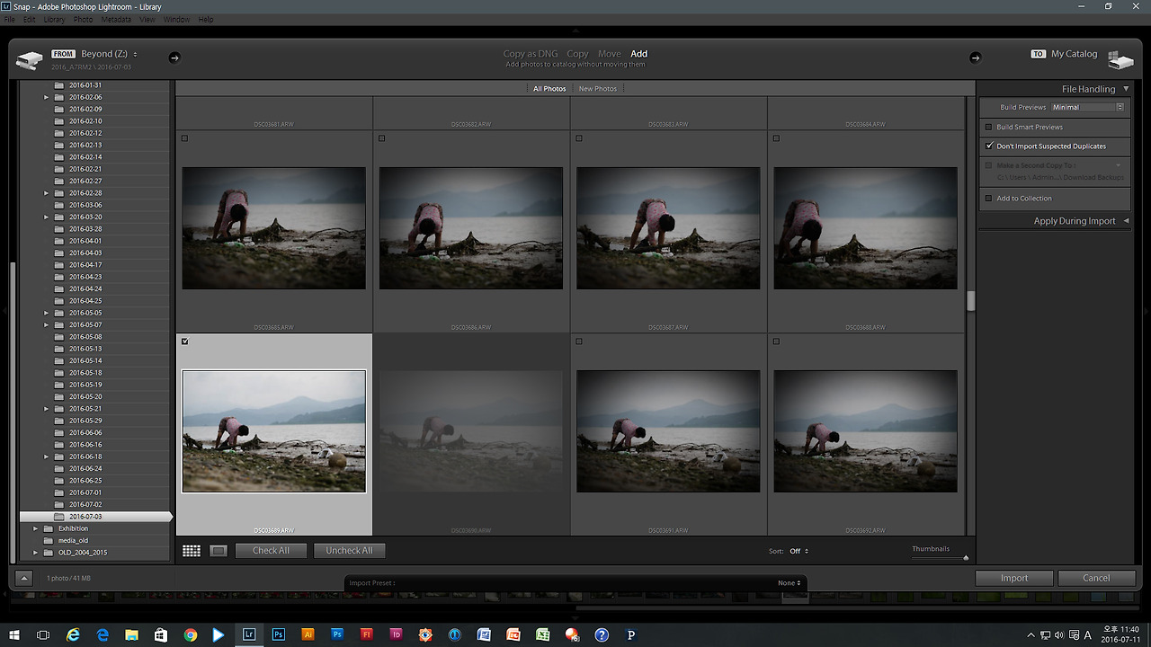 좋은 사진을 촬영하는 것 못지 않게 좋은 사진을 선별하는 것 또한 매우 중요한 일이다. 여러사진을 리뷰하고 촛점이 잘 맞았는지 주제표현에 적절한 구도가 되었는지, 노출은 적절한지 등을 여러 각도에서 살펴보고 가장 마음에 드는 컷 '하나'를 선정한다. 애매한 상황이라면 2~3장도 괜찮지만 집중을 위해서 나는 보통 1장을 선택하는 편이다.