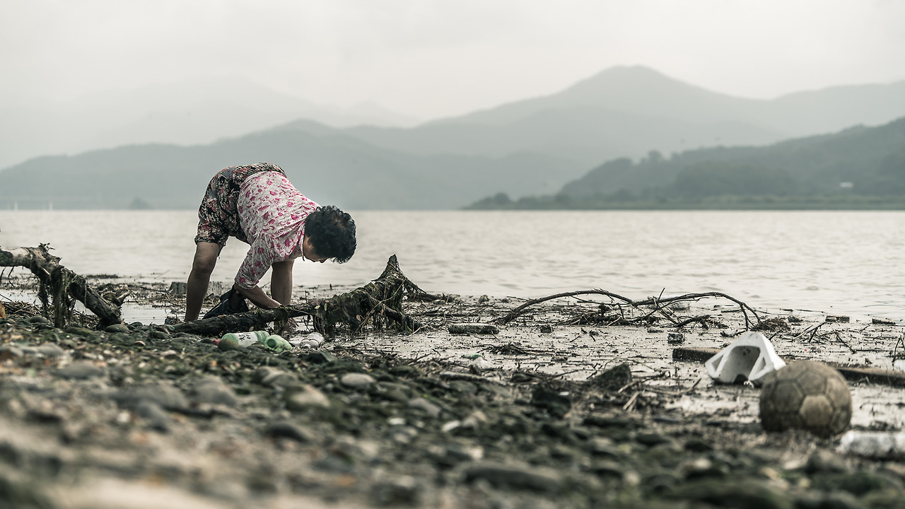 처음 할머니를 발견했을 때 솔직하게 소름이 돋았다. 멀리서 뭔가 물가에서 움직이고, 사람같기는 한데 허리가 90도이상 꺽인 채 흐느적 흐느적 움직이는 것이 공포심이 덜컥 다가왔다. 비록 흐린날로 인해 광원이 부드러워 섬뜩한 장면의 연출은 다소 힘들겠지만 처음 느꼈던 감정이 살아날 수 있게 보정을 시도해 보자. 그렇다고 할머니를 무서운 귀신처럼 묘사하는 악의적인 의도는 절대 없다. 평소에 보기 어려운 낯선 인물과 장마 이후 어지럽게 훼손된 물가의 분위기를 적절하게 대비시켜 표현하려고 한다.