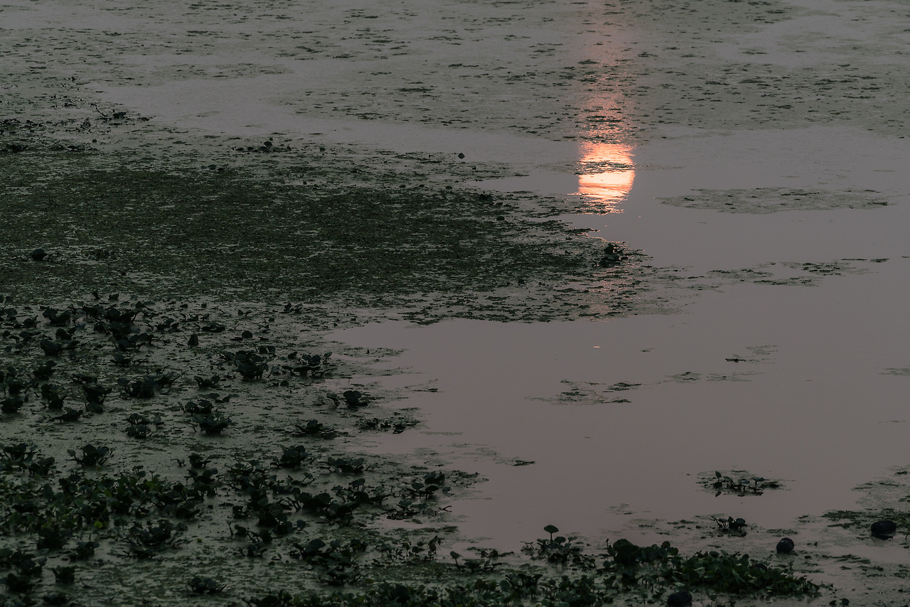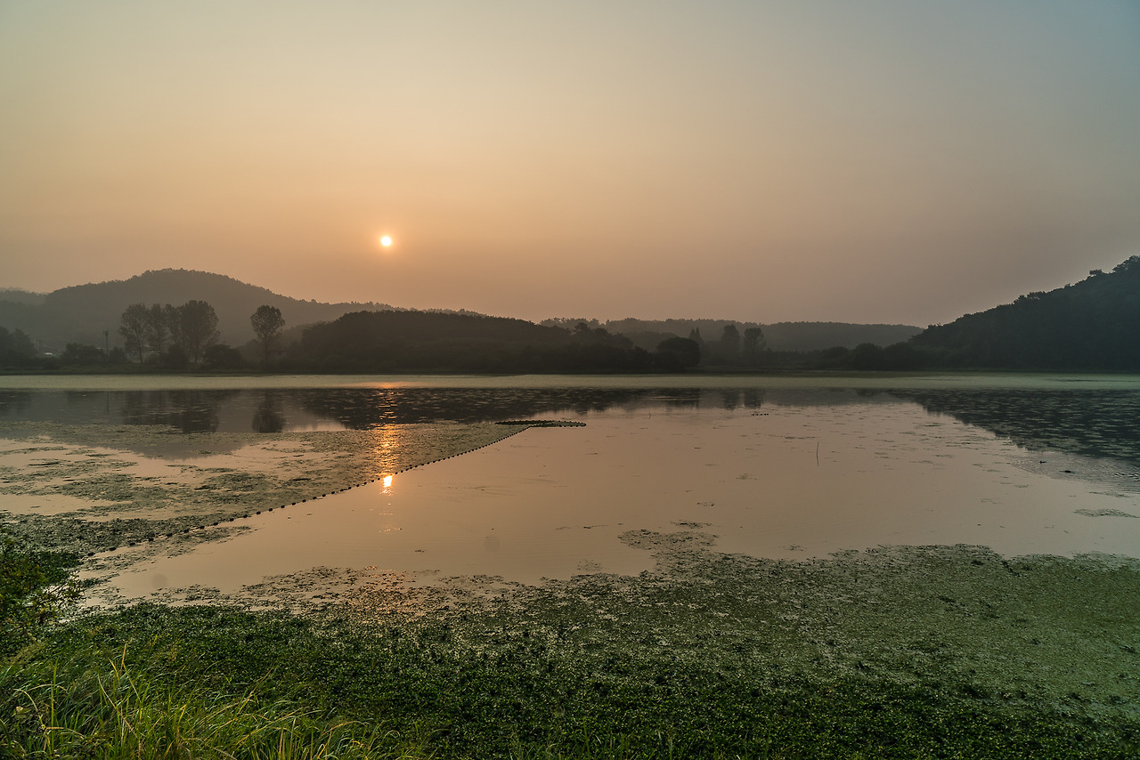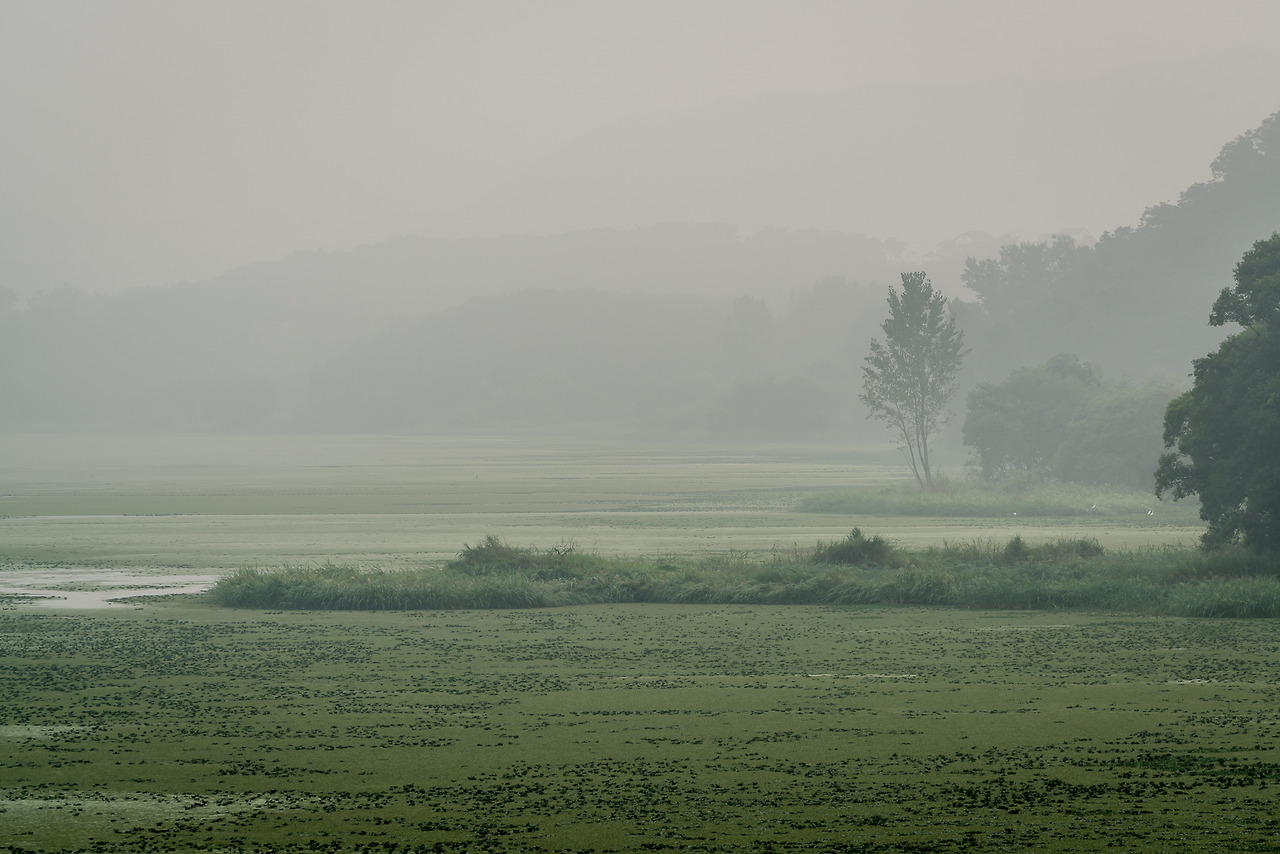 여름의 우포 수면은 이름 조차 모르는 작은 잎들과 풀 같은 매우 작은 생명체로 뒤덮혀있다. 따라서 독특한 형상의 반영을 기대하는 것조차 힘들어 보인다. 해 뜨는 시각 태양의 반영이 어스름한 밝기로 수면에 비칠 때는 보통의 저수지 풍경과는 확연히 다른 묘한 느낌을 주었다. 두터운 안개층으로 인해 풍부하고 따뜻한 색은 만들어주지 못했지만...