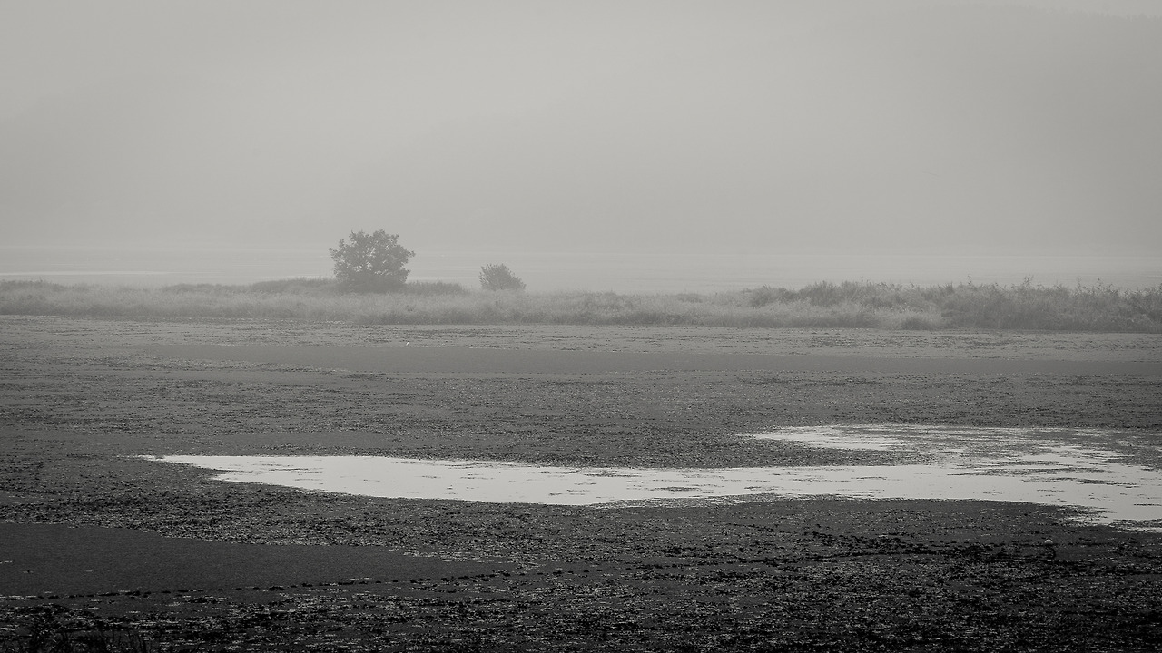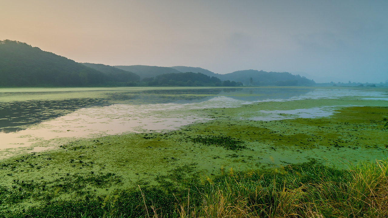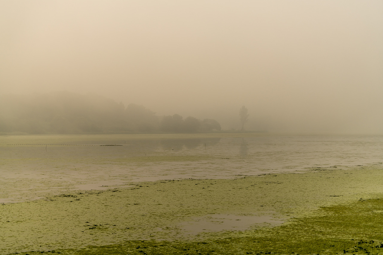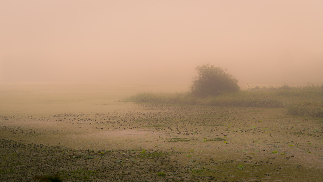 여름의 우포 수면은 이름 조차 모르는 작은 잎들과 풀 같은 매우 작은 생명체로 뒤덮혀있다. 따라서 독특한 형상의 반영을 기대하는 것조차 힘들어 보인다. 해 뜨는 시각 태양의 반영이 어스름한 밝기로 수면에 비칠 때는 보통의 저수지 풍경과는 확연히 다른 묘한 느낌을 주었다. 두터운 안개층으로 인해 풍부하고 따뜻한 색은 만들어주지 못했지만...