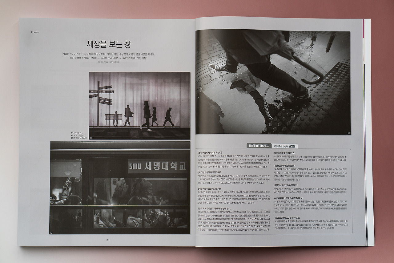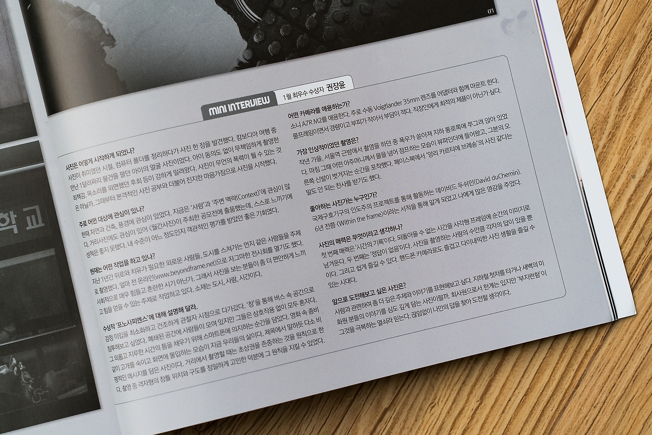 2017년 1월호에 실린 짤막한 인터뷰 내용을 포스팅한다. 월간 사진은 국내 얼마 되지 않는 사진 잡지 중 하나이며 대중성, 예술성, 기술적이고 문화적인 접근 등 편견 없이 밸런스가 맞는 내용을 담는 좋은 잡지다. 실력도 키우고 객관적인 평가도 받을 겸 매달 꾸준하게 응모한 콘테스트에서 10월 '공간'을 주제로 할 때 우수작, 12월 '창'을 주제로 하는 콘테스트에서 최우수작이 되었다.