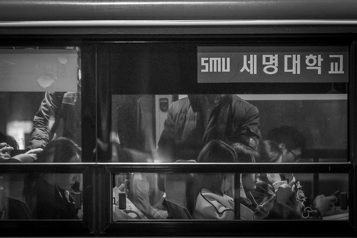 감정 이입을 최소화하고 건조하게 관찰자 시점으로 다가갔다. 창이라는 투과성 물질을 통해 버스 속 공간으로 침투해보고 싶었다. 폐쇄된 공간에 여러 사람들이 모여 있지만 상호작용 없이 모두 혼자다. 그 외롭고 지루한 시간의 틈을 채우기 위해 스마트폰에 의지하는 순간을 담았다. 좀비 영화의 좀비와 같이 고개를 숙이고 5인치 화면에 몰입하는 모습이 지금 우리들의 삶이 되었다. 제목에서 말하듯 다소 비평적인 메시지를 담은 사진이기도 하다. 거리에서 촬영할 때 지키는 원칙이 있다. 시민들의 초상권을 존중해야 한다는 것. 촬영 중 격자형의 창틀의 위치와 구도를 정밀하게 고민하여 그 원칙을 지킬 수 있었다.