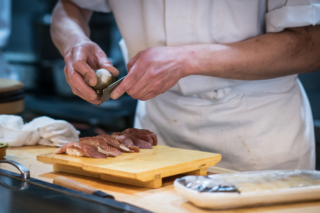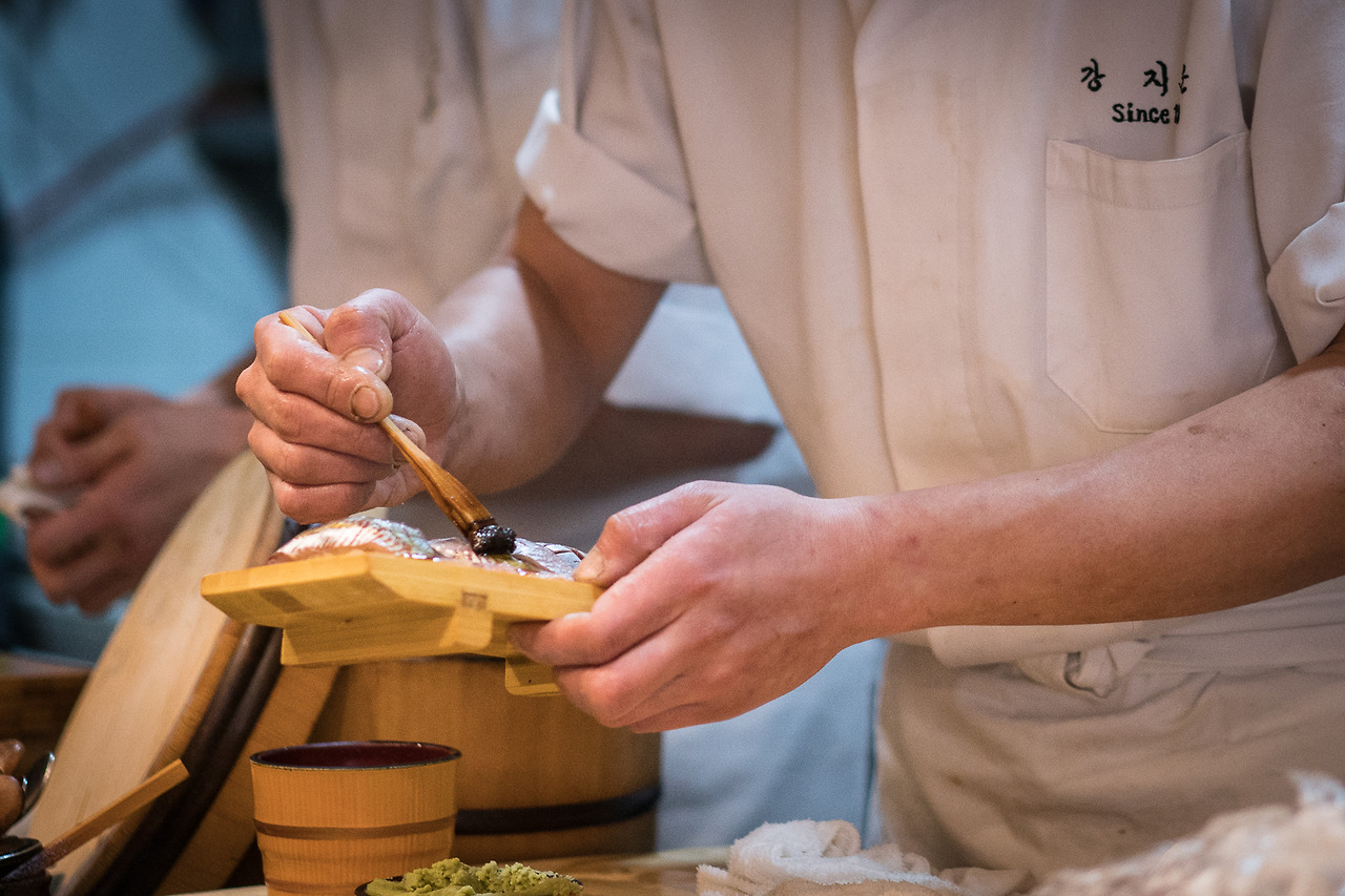 고추냉이를 갈아서 쌉싸름한 향기와 맛을 더한다. 모든 양념과 향은 초밥의 종류마다 다르다. 따로 고추냉이 간장을 찍어먹지 않아도 될 만큼 각자 손님의 취향에 맞춰서 만들어주신다.