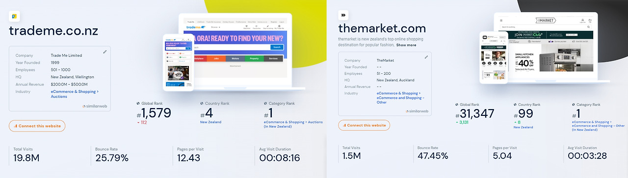 웹사이트 트래픽 분석사이트인 similarweb 에 의하면 trademe 의 평균체류시간 및 페이지 뷰는 각 8분과 12페이지 이상인데 반해 themarket 은 3분에 5페이지 정도에 불과합니다.