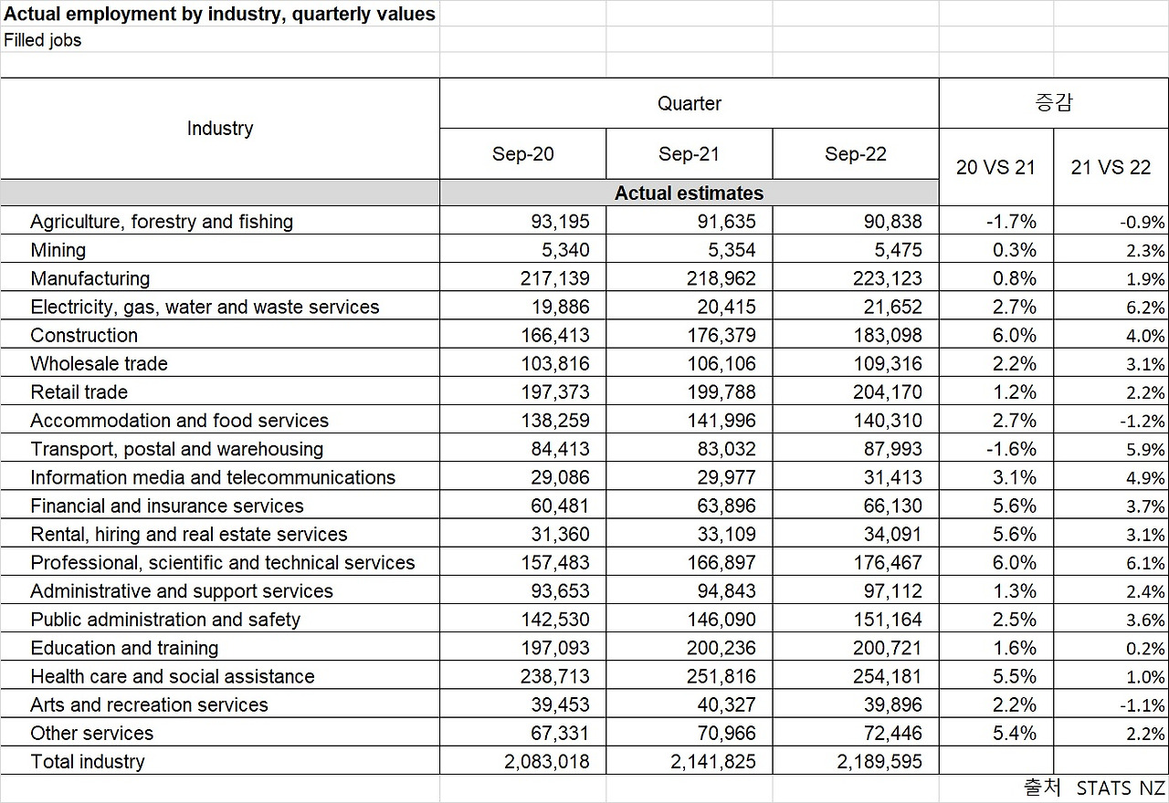 2022년 12월 현재 뉴질랜드 실업율은 3.3% 로 추정되고 있습니다. 보통 4% 정도의 실업율을 완전 고용상태로 보는데 현재의 지표는 노동시장이 확연히 buyer’s market 임을 말해줍니다. 위의 그래프에 보면 2021년 하반기에 접어들면서 실업율이 급감하기 시작했는데 이는 팬데믹으로 인한 국경봉쇄 영향이 본격적으로 나타나는 시점으로 보입니다. 즉, 단기 취업비자 소지자가 뉴질랜드를 완전히 떠나고 그 자리를 기존 실업인구들이 메꿔나가는 형국으로 판단됩니다. 갑작스런 구인난이 시작되자 기업은 임금인상을 통해 노동인력을 유지 또는 확보하기 시작했고 기존 취업인구와 함께 특별영주권 혜택을 받은 신규 영주권자들이 보다 양질의 일자리를 찾아 대이동하는 극심한 혼란의 시간이 지속되면서 노동시장에는 과거와는 다른 몇가지 특이점이 발견되기 시작합니다.