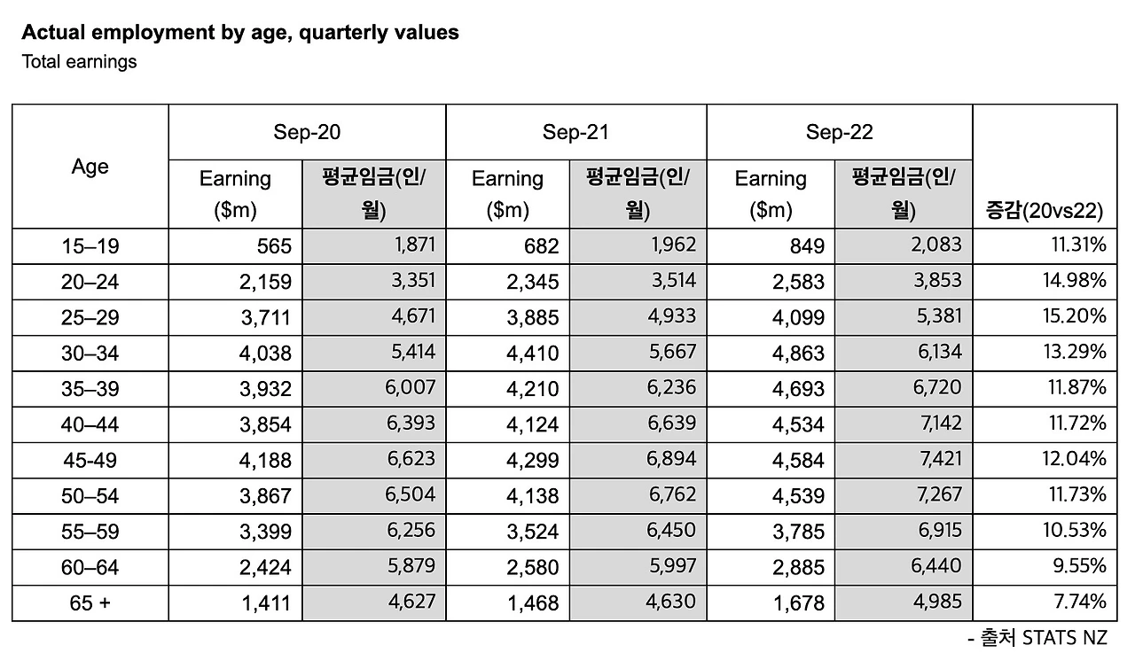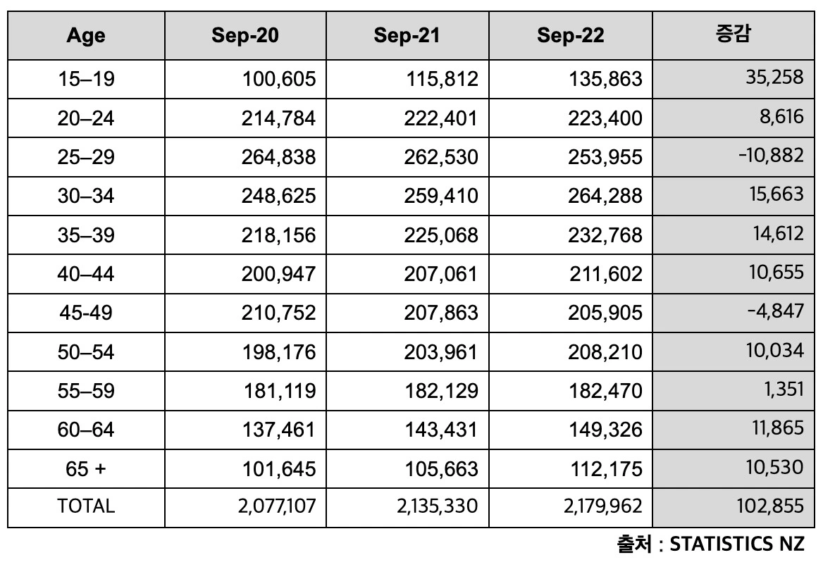 팬데믹 기간이었던 2020년에서 2022년까지 뉴질랜드의 연령별 취업자 현황은 다음과 같습니다.
