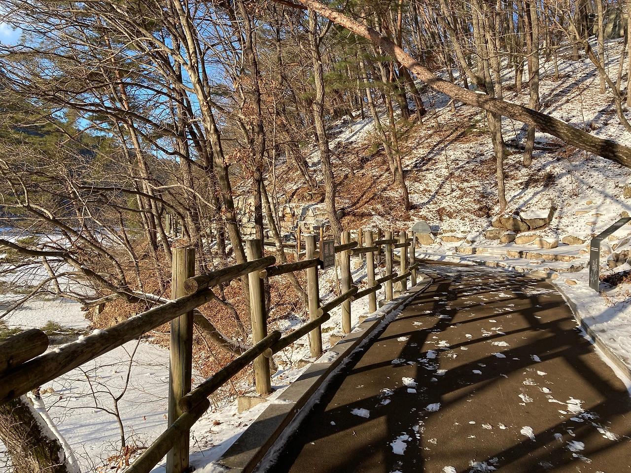 산길은 눈에 덮여 있었다. 갑자기 큰아이가 미끄러져 넘어졌다. 알고 보니 눈 아래는 얼음판이었다. 큰아이는 넘어지는 와중에도 본능적으로 카메라를 보호했다. 카메라가 잘 작동하는 것을 확인하고 안도의 한숨을 쉬었다. 괜히 고생해서 산길로 넘어왔는데, 새는 못 보고 넘어지기만 했다. 인생이 뭐 항상 잘 풀리기만 하나. 잘 안될 때도 있는 거지. 다행히 산길은 호수 둘레길과 나란히 나 있었다. 우리는 가던 방향으로 계속 갔다. 한참을 걸어가니 결국 둘레길과 만나는 곳까지 갈 수 있었다.