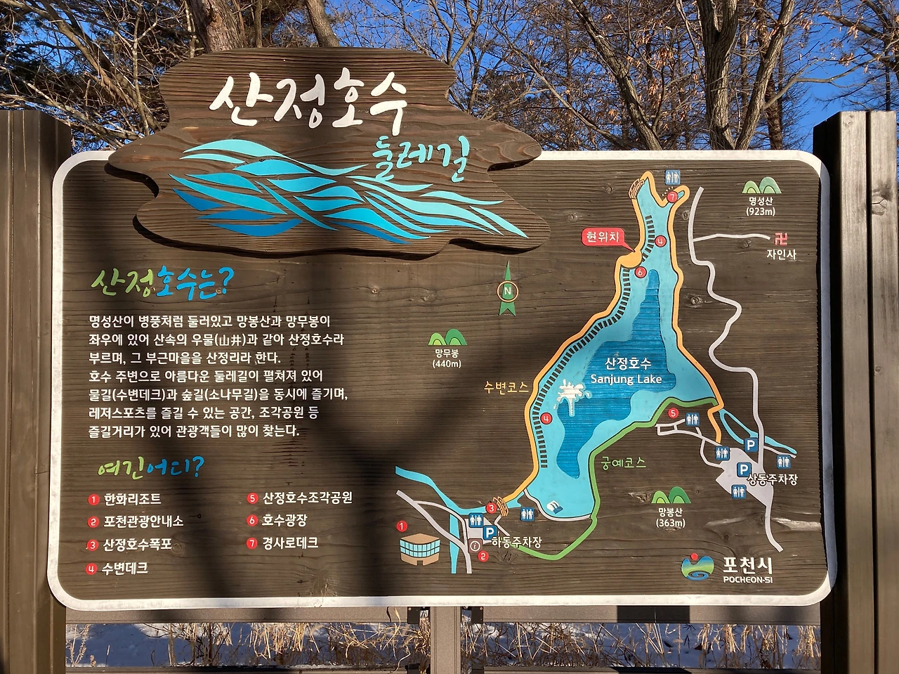 서둘러 돌아온 덕에 너무 늦지 않게 콘도에 도착했다. 간단하게 컵라면으로 요기를 하고 짐을 챙겼다. 체크아웃을 하고 차에 올랐다. 나와 큰아이는 어제 오늘 산정호수를 두 번이나 보았지만, 작은아이와 와이프는 구경도 못했다. 여기까지 와서 그냥 갈 수는 없었기에, 차를 타고 산정호수 주차장으로 갔다. 거기에서는 5분만 걸어가면 산정호수까지 갈 수 있다.