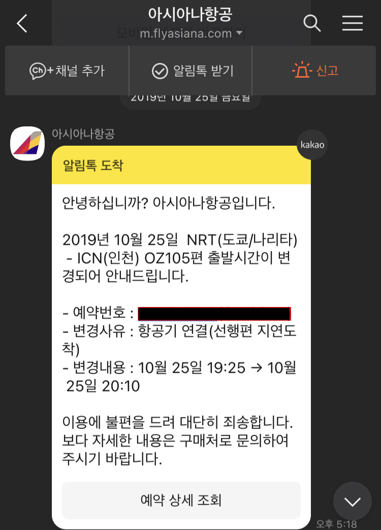 갑자기 카톡 메시지가 왔다. 아시아나에서 보낸 것이다. 19:25 출발 예정이었던 내 비행기가 20:10 출발로 연기되었단다. 오예~~ 비행기 연착이 이렇게 반가울 줄이야. 하늘이 돕고 있구나.