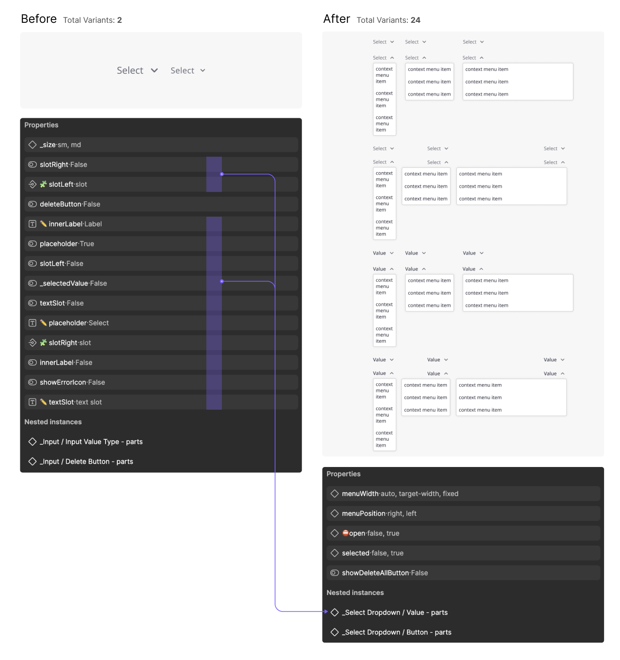 개선 전: Select Dropdown의 전체 Variants는 290개 (Base Component 포함)