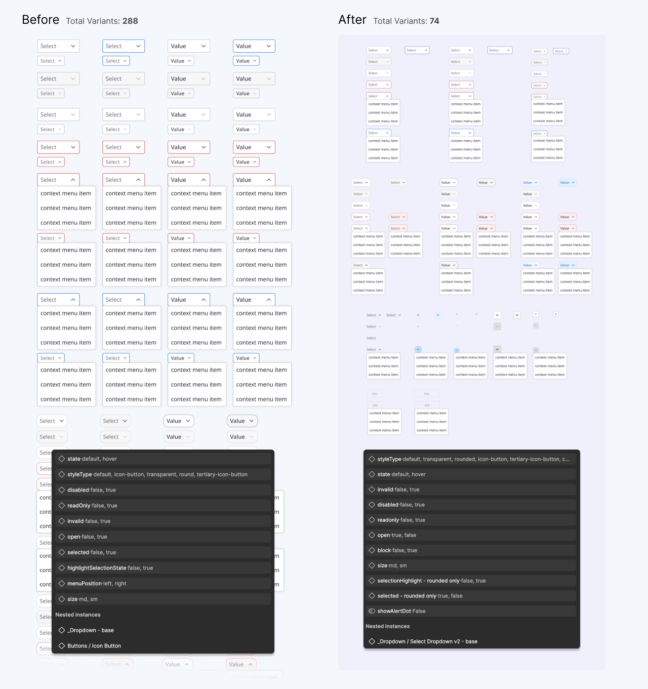 개선전 Select Dropdown 컴포넌트의 전체 variants수는 288개였습니다. 일부 스타일이 특정 속성을 가지지 않더라도, Variants의 총 개수는 크기 × 색상 × 상태와 같은 조합으로 계속 증가했습니다. 만약 속성을 하나만 추가하더라도 Variants는 288 × 2 = 576개로 2배 늘어납니다. 이는 관리와 유지보수에 큰 부담을 주는 상황이었습니다.