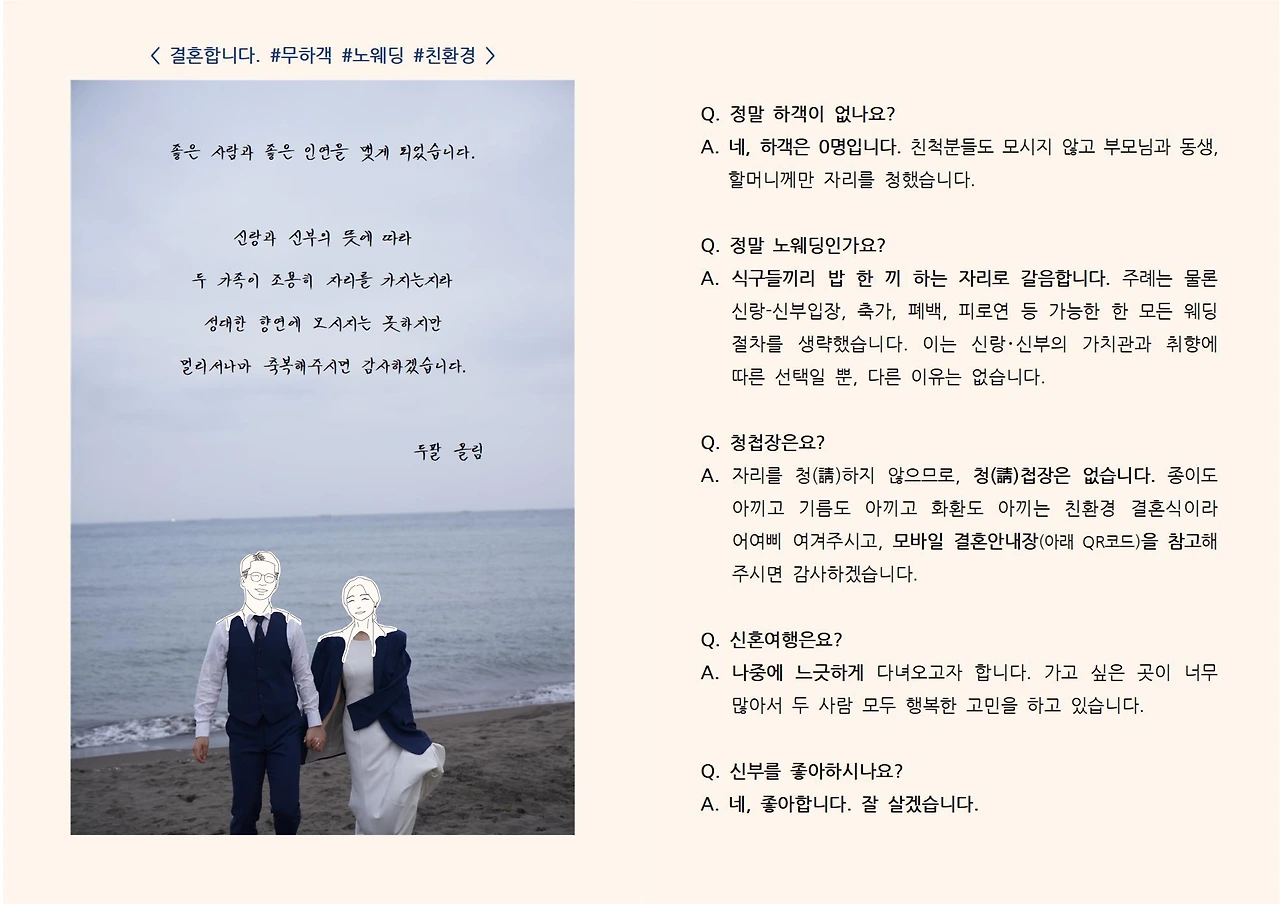 손편지 밑으로 Q&A 방식의 글을 올렸다. 너저분하게 늘어지지 않으면서, 강조하고 싶은 부분들을 명확히 얘기할 수 있었기 때문이다. 이를 통해 하객이 없고, 결혼식이 없으며, 청첩장도 없음을 힘 있게 안내할 수 있었다. 친척도 모시지 않는다는 것, 피로연도 없다는 것, 화환도 안 받는다는 것 등도 함께 껴넣어 안내했고, 글의 말미에는 신부에 대한 애정을 애교있게 표현하며 밝게 마무리하고자 했다.