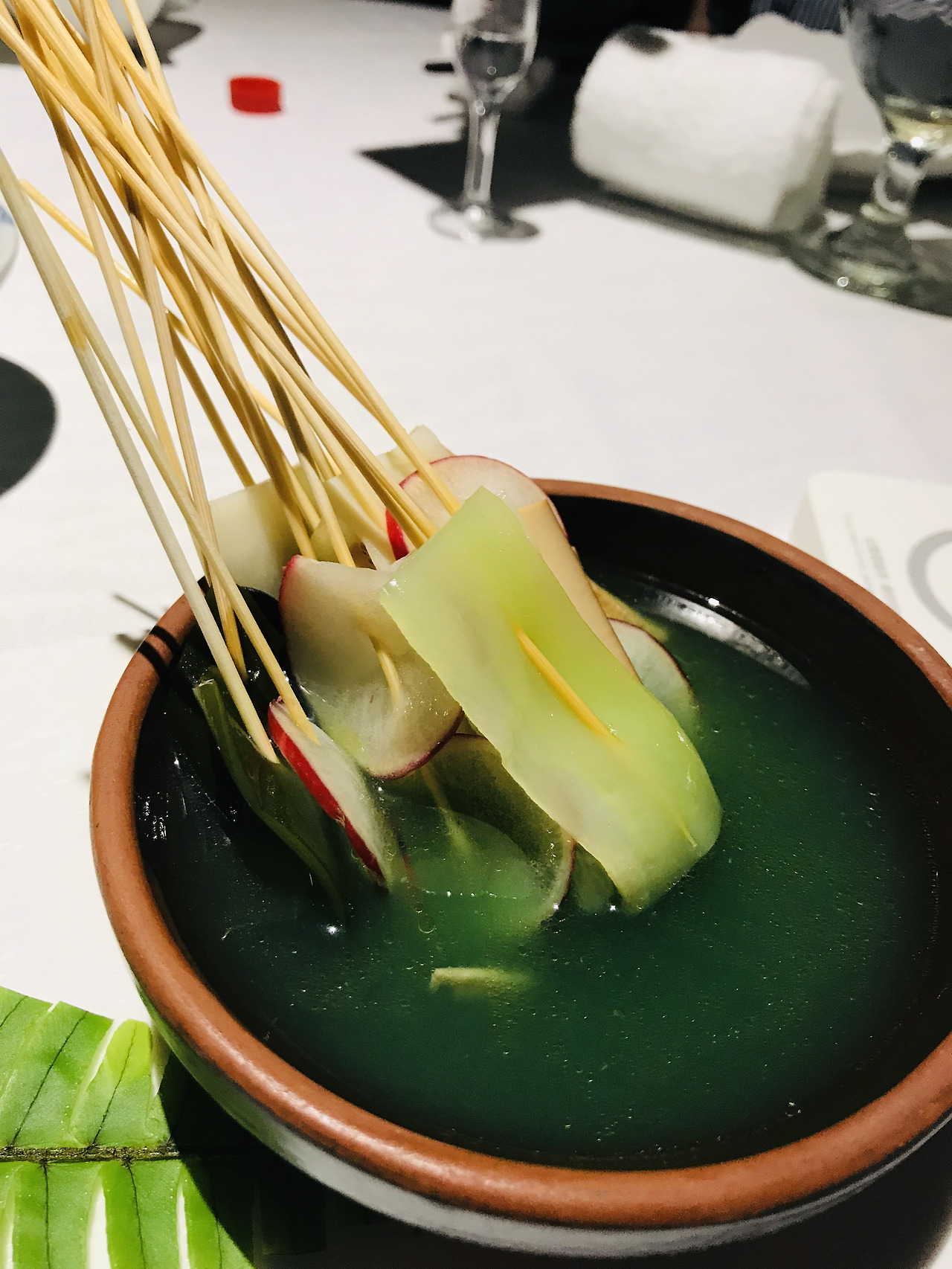 다음은 소 힘줄과 내장 등을 꼬치에 꽂은 다음에 청고추 홍고추 소스에 푹 담가 먹는 요리인데 요고이 완전 맥주 안주다.
