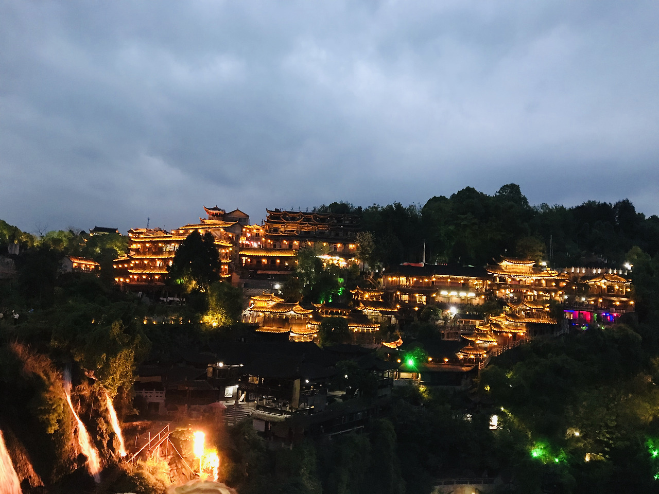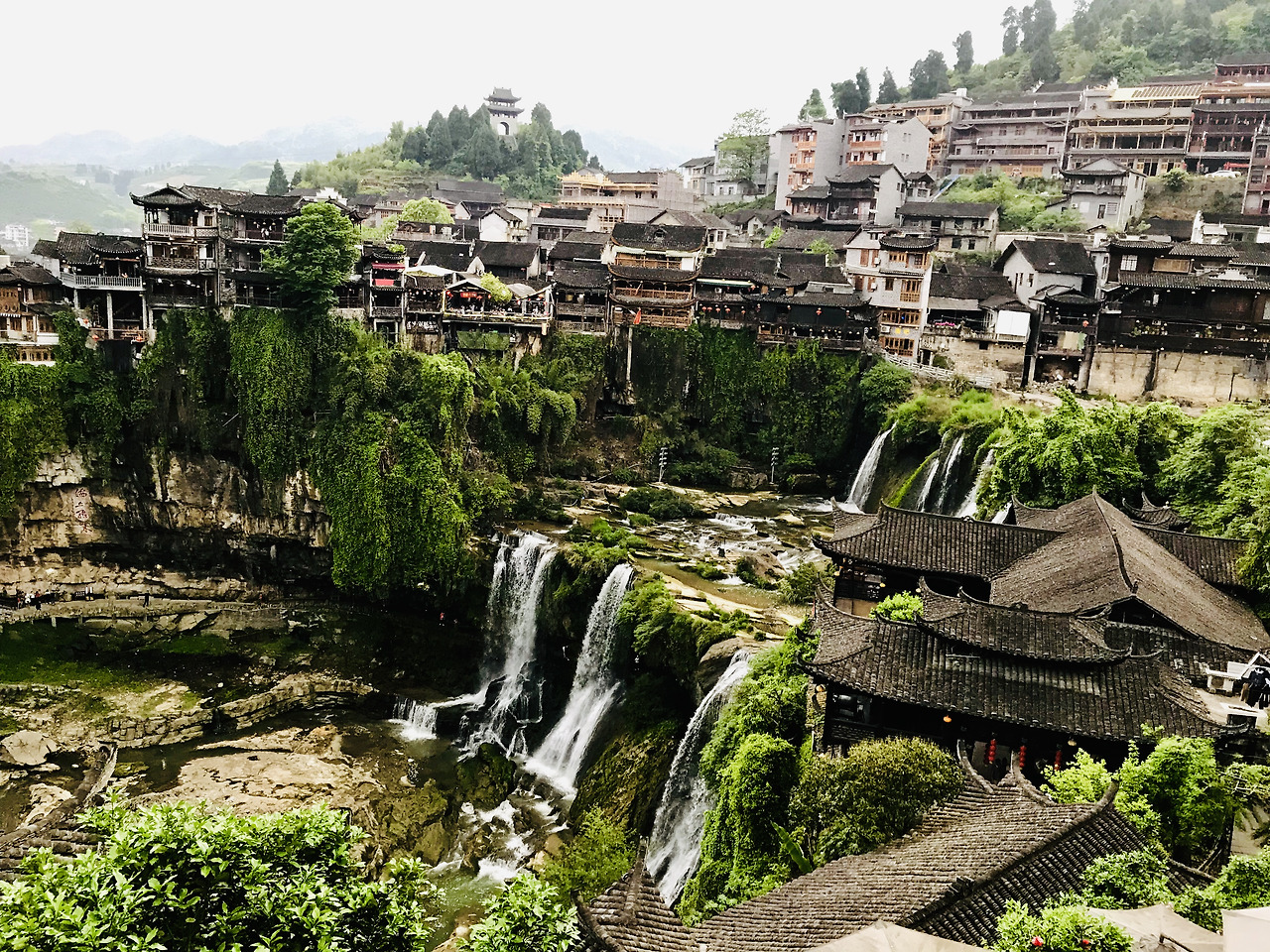 주변 산세와 꼭 맞게 모양을 맞춘 토가족 가옥의 처마는 미인의 입꼬리처럼 사뿐하게 말려 올라가 폭포와 원래 한 몸인 양 조신하게 병풍을 둘러친 듯 절벽 위에 얹혀 있다.