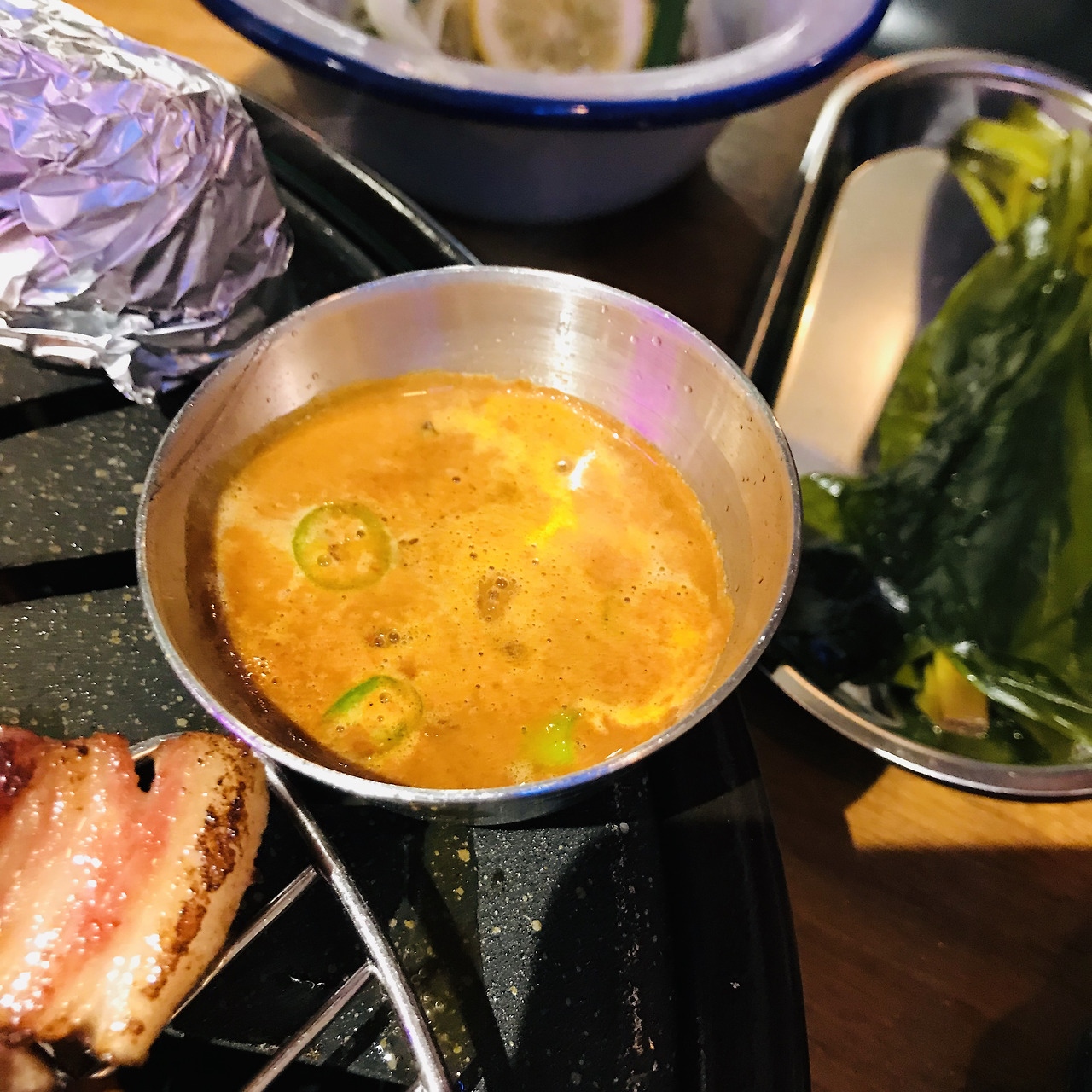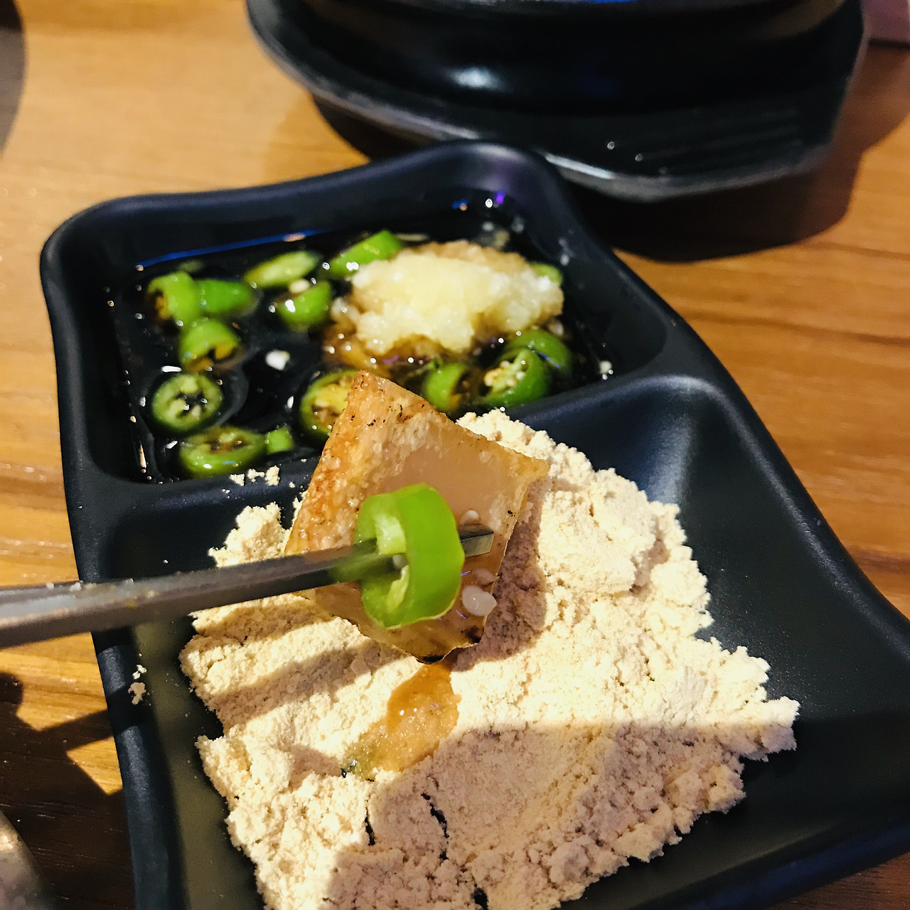 이 집이 섬세한 이유는 껍데기를 주문하면 장류와 상차림을 다시 낸다. 마늘과 간장, 청양고추가 든 장과 콩가루가 같이 나오는 데 딱 껍데기 맞춤형 장이다. 이게 번거로울 법도 한데 꼭 이렇게 해준다.