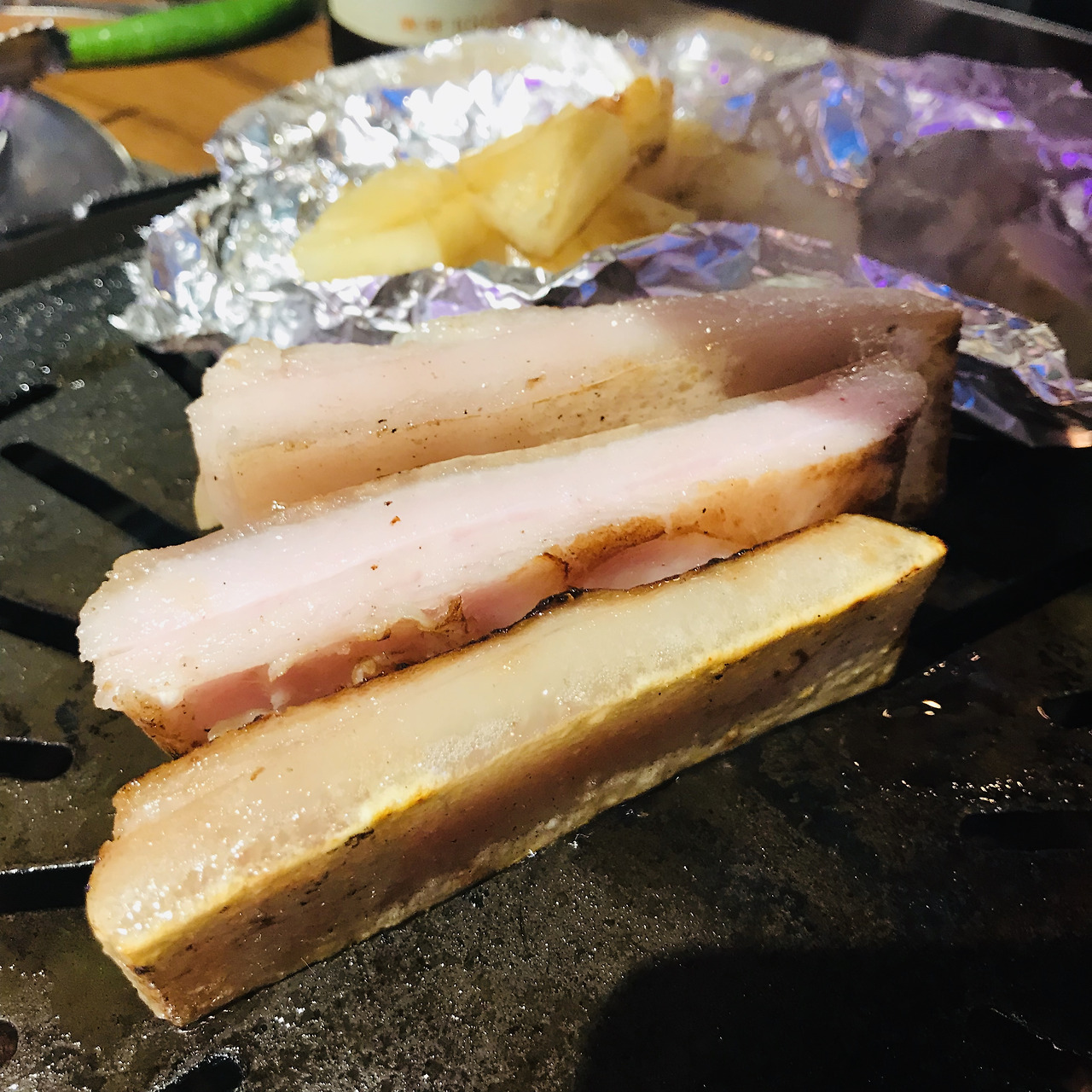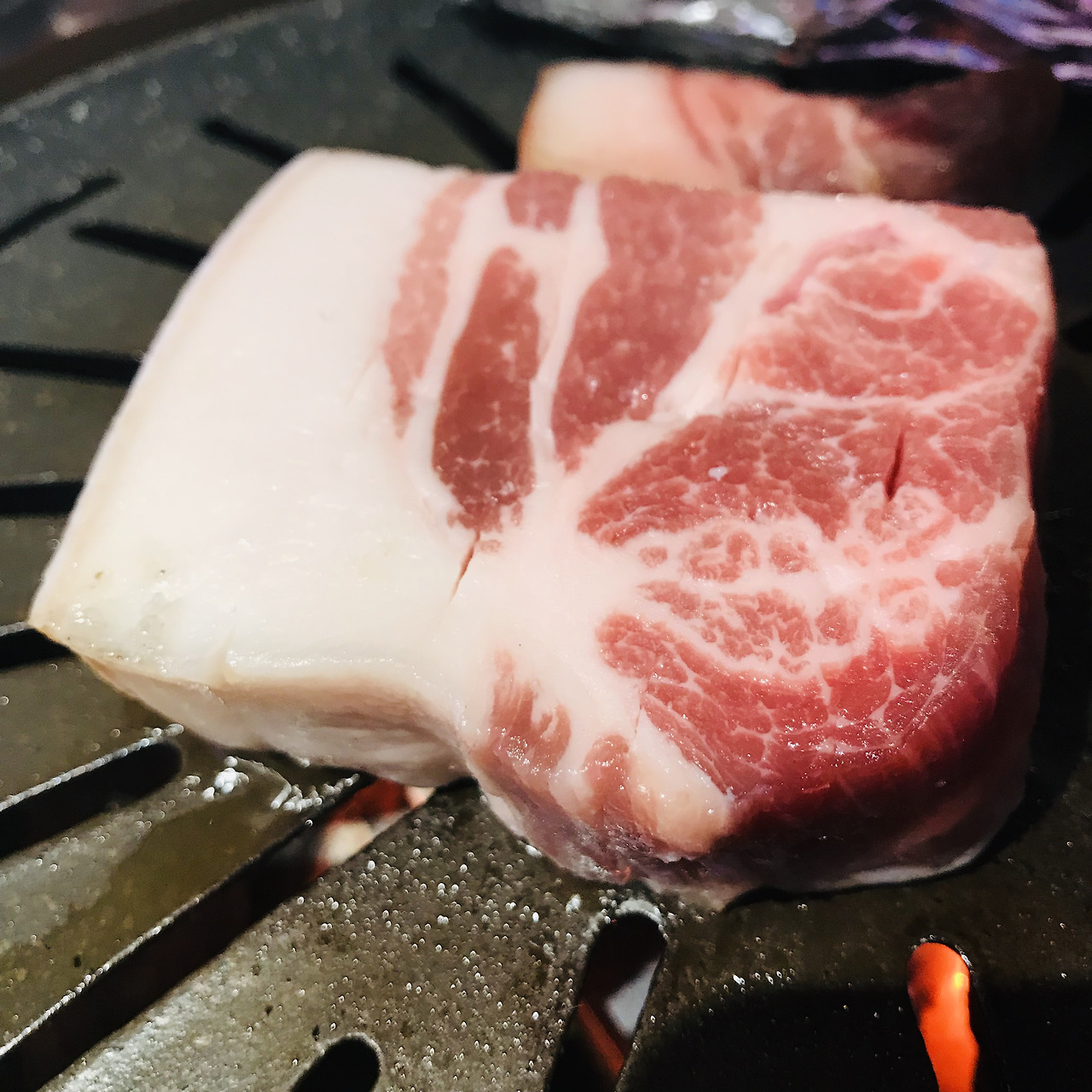 다음은 항정살. 항정살은 다들 알다시피 비계인 듯 비계 아닌 살코기 같은 고기다. 식감이 아주 좋은 부위여서 많은 사랑을 받고 있다. 항정살은 돼지 경추를 덮고 있는 부위인데 이 집은 도축을 어떻게 하는지 항정살을 덩어리째 가져다가 두텁게 구워준다. 고기를 구울 때 보면 사선으로 잘라서 굽는데 육즙 보전에 아주 도움이 되는 구이 방법인 것 같았다.