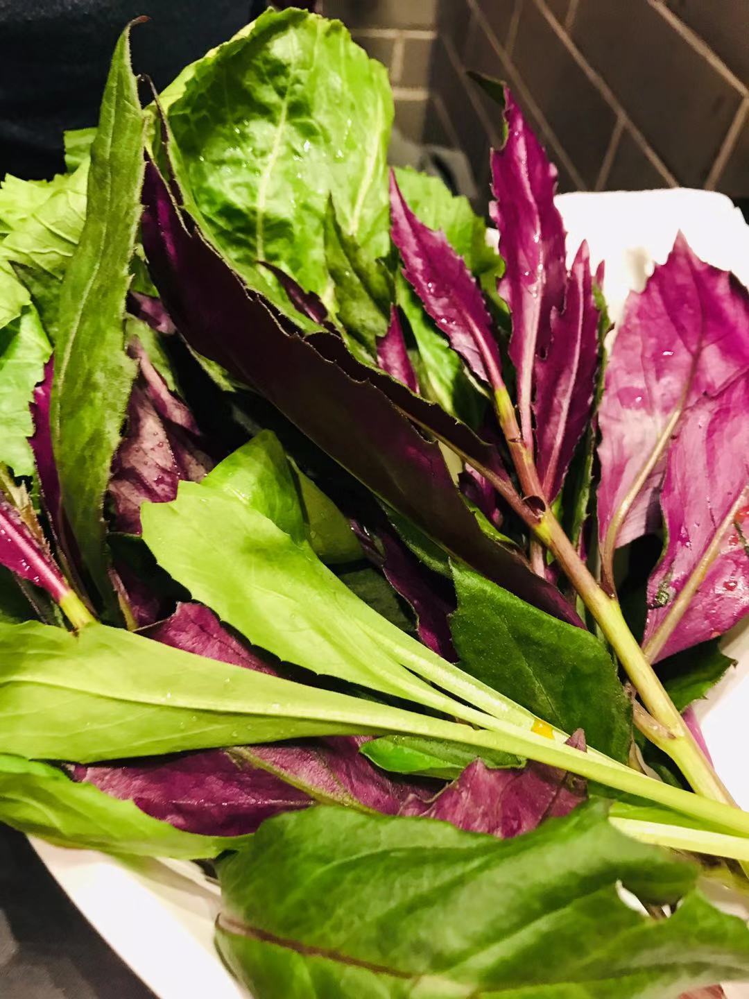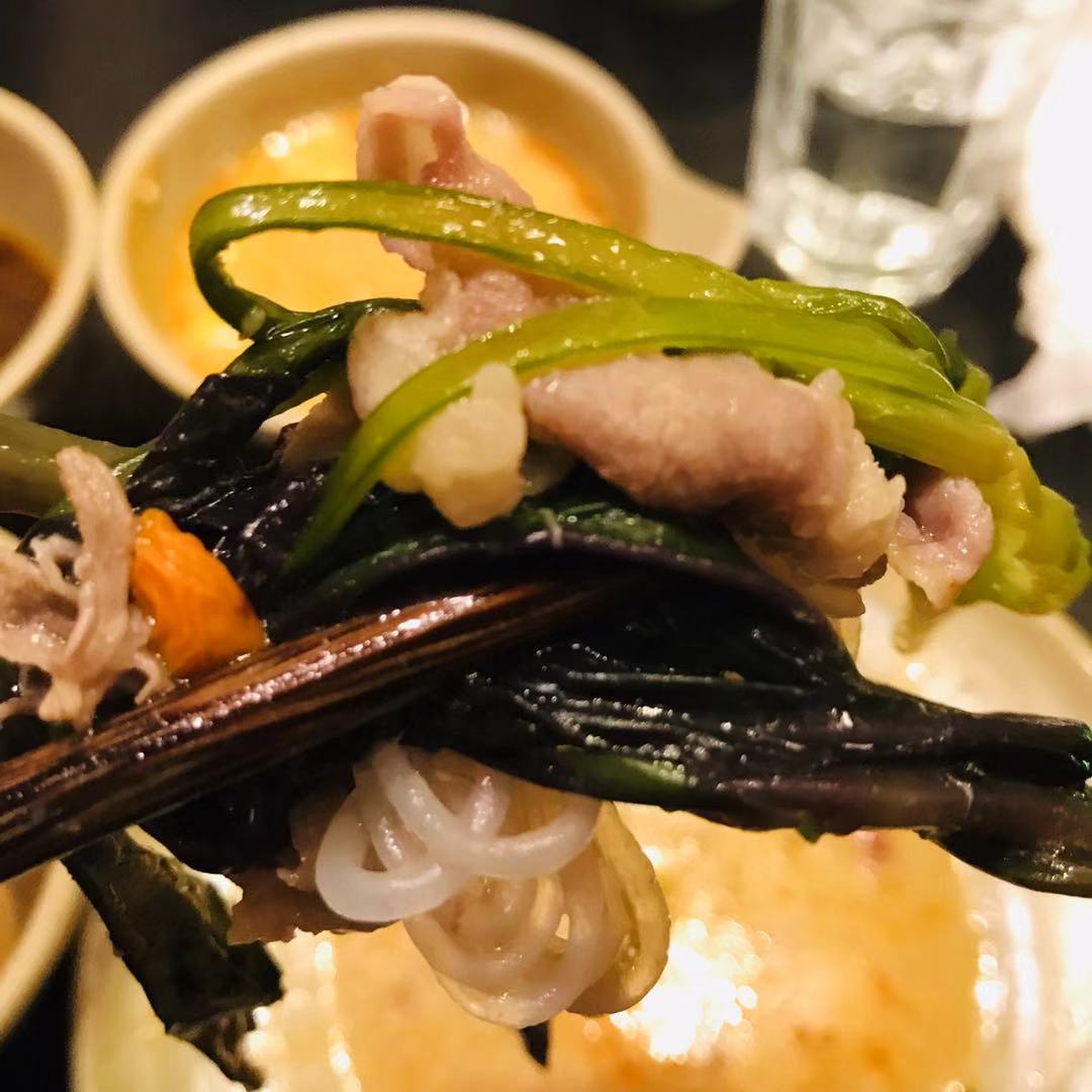 산채는 반씩 나눠 각각 육수에 담갔다. 산채의 맛이 상상이 안 갈텐데 생긴 게 저렇게 보이지만 의외로 점성이 느껴질 정도로 질긴 느낌도 나고, 한입 먹으면 향긋한 내음이 입안에 사악 퍼진다. 그냥 산채만 먹어도 되고, 고기나 야생버섯, 각종 사이드 재료를 한 번에 산채에 싸서 먹어도 맛있다.