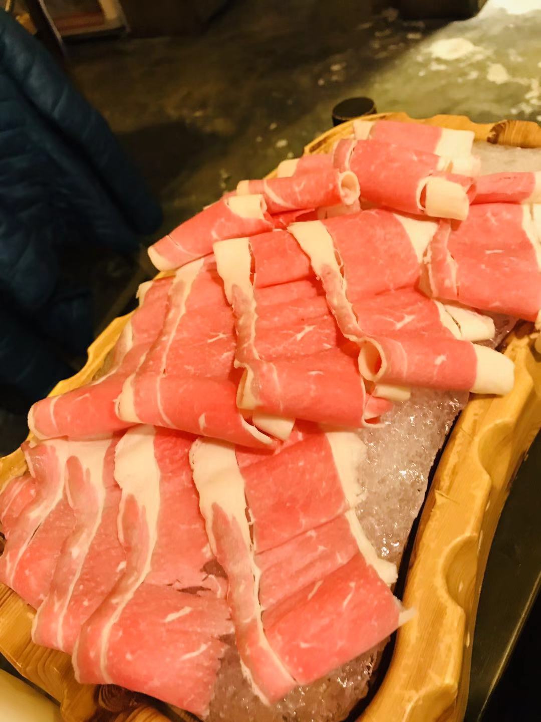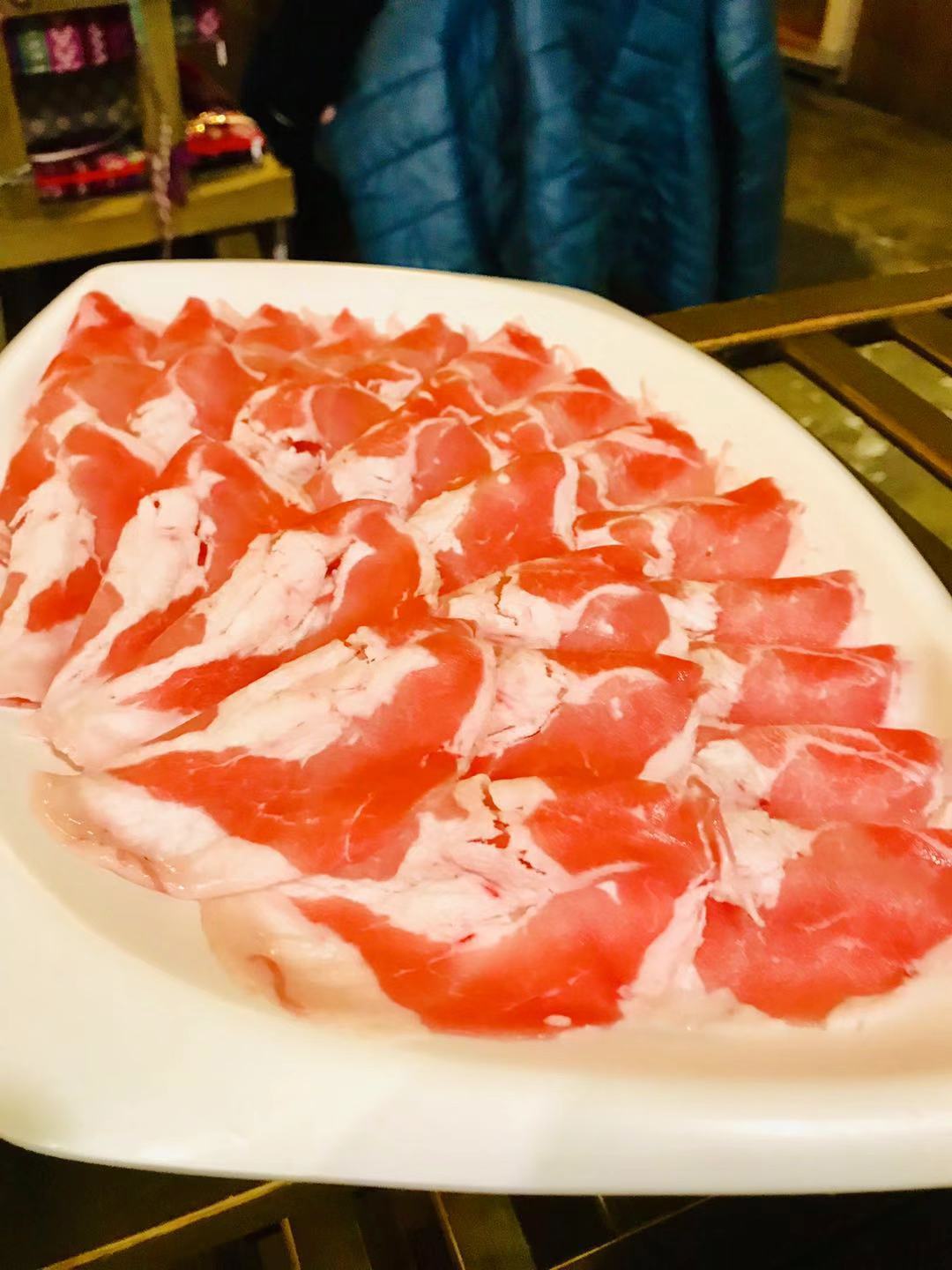 그다음은 역시 훠궈하면 고기가 빠질 수 없지 않겠나. 이 집은 하랄 푸드를 사용하는 신장 훠궈 집 만큼 육질이 좋진 않지만, 손으로 직접 썬 양고기 세트가 있다. 기름진 부위, 된살 부위, 기름과 살이 적절히 섞인 부위까지 모두 한 쟁반에 담겨 나온다. 여기서 끝이냐? 아니다. 대패 삼겹살처럼 슬라이스로 썬 양고기와 소고기도 추가했다.
