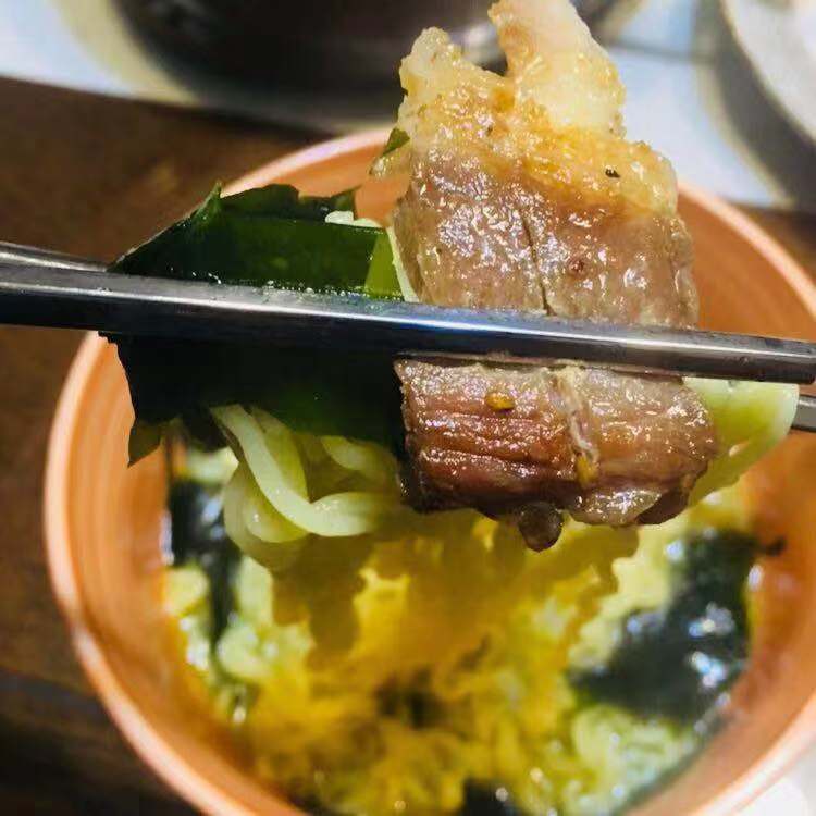 세 번째는 의외로 삼겹살이다. 장난하나 또 튀려고 으휴? 라고 할 수 있겠지만 사실이다. 삼겹살은 오늘 저녁 애들을 먹이려고 구웠는데 그중 절반이 남아서 미역국 라면과 함께 먹었다. 의도한 것은 아닌데 삼겹살을 프라이팬에 다시 덥힐까 하다가 귀찮아서 그냥 먹었다. 한참을 놔둬선지 고기 기름이 좀 굳었고, 대신 기름기가 쭉 빠져나간 상태였다. 미역국 라면이 소고기 육수를 베이스로 하기 때문에 느끼하지 않을까? 하면서 한 젓가락 떴는데 느끼할 것이란 생각은 나의 기우였다. 잘 생각해보니 '폭 고운 소고기 육수의 구수함+삼겸살의 질펀한 돼지비계의 고소함'이 어우러져 미역국 라면 면발에 참기름 코팅이 된 것처럼 고소함이 극대화된 맛이 났다.