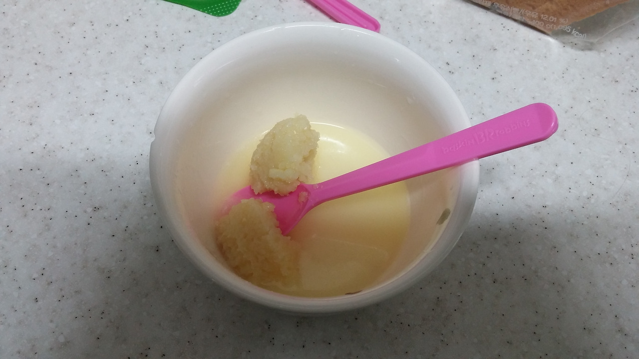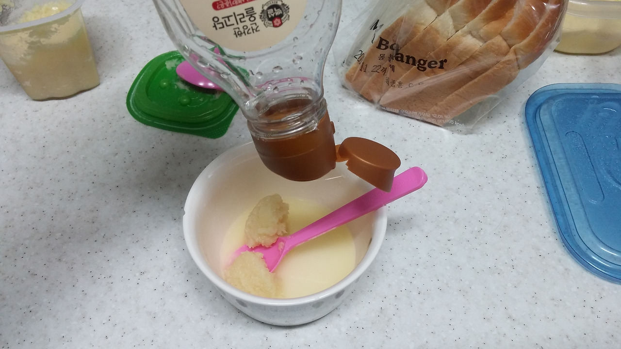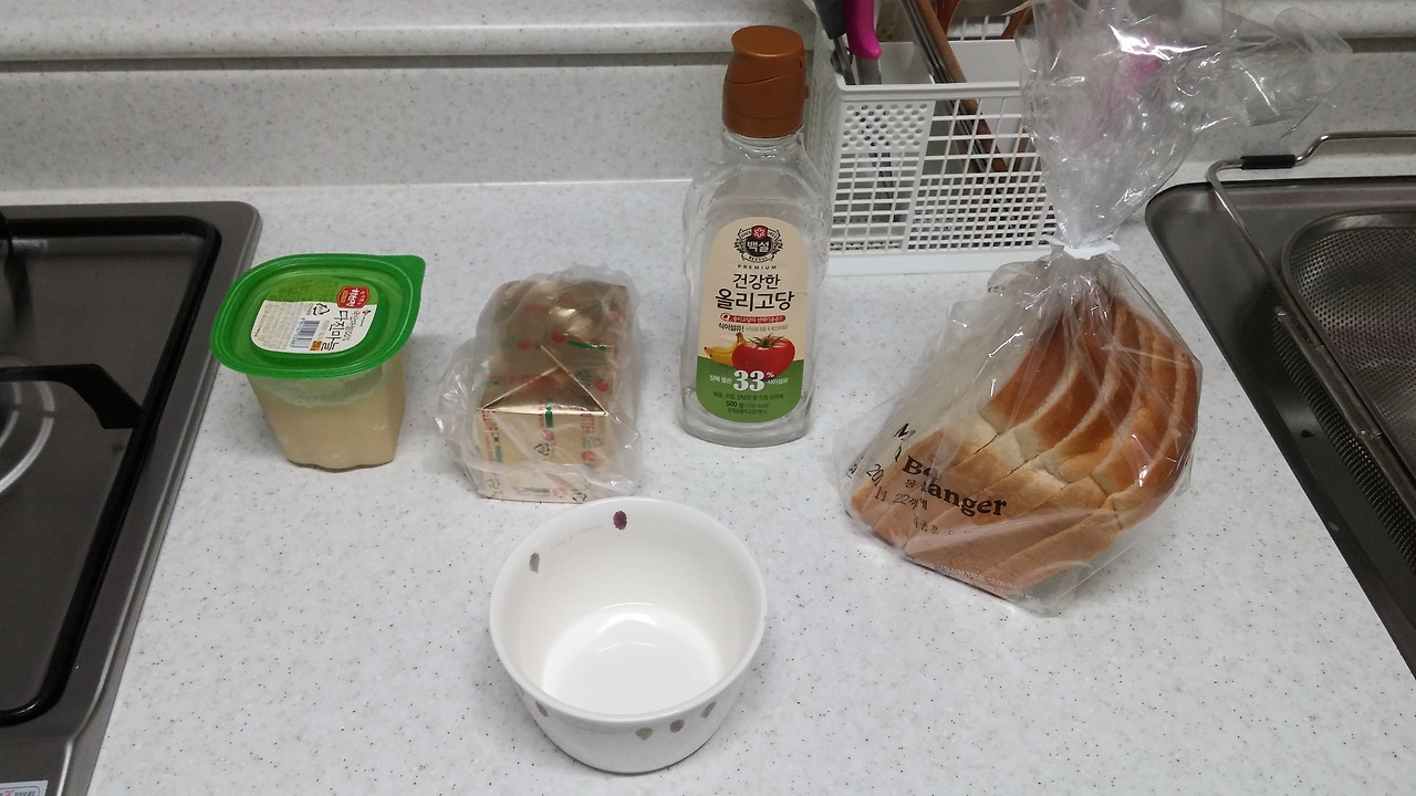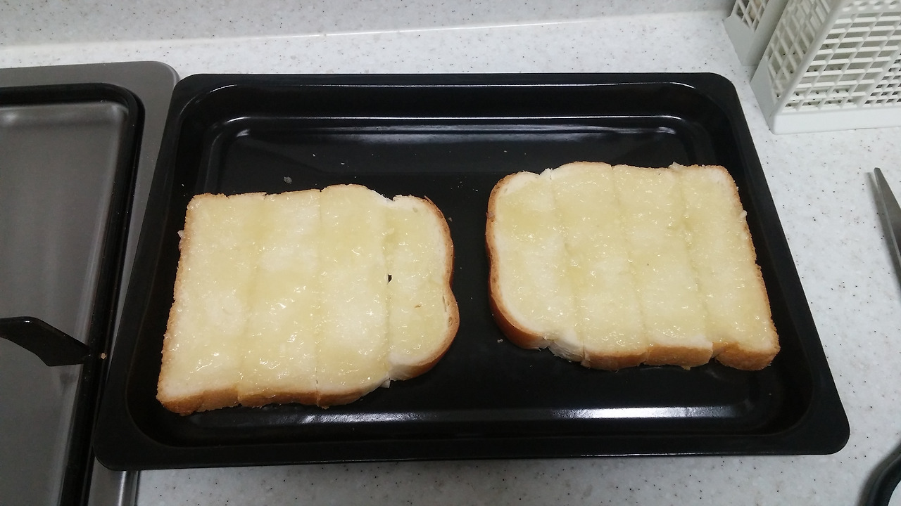 버터 30g(저도 대충 자른거라서 정확하진 않지만 저정도...), 다진마늘 1.5티스푼, 올리고당 2 숟갈, 식빵
