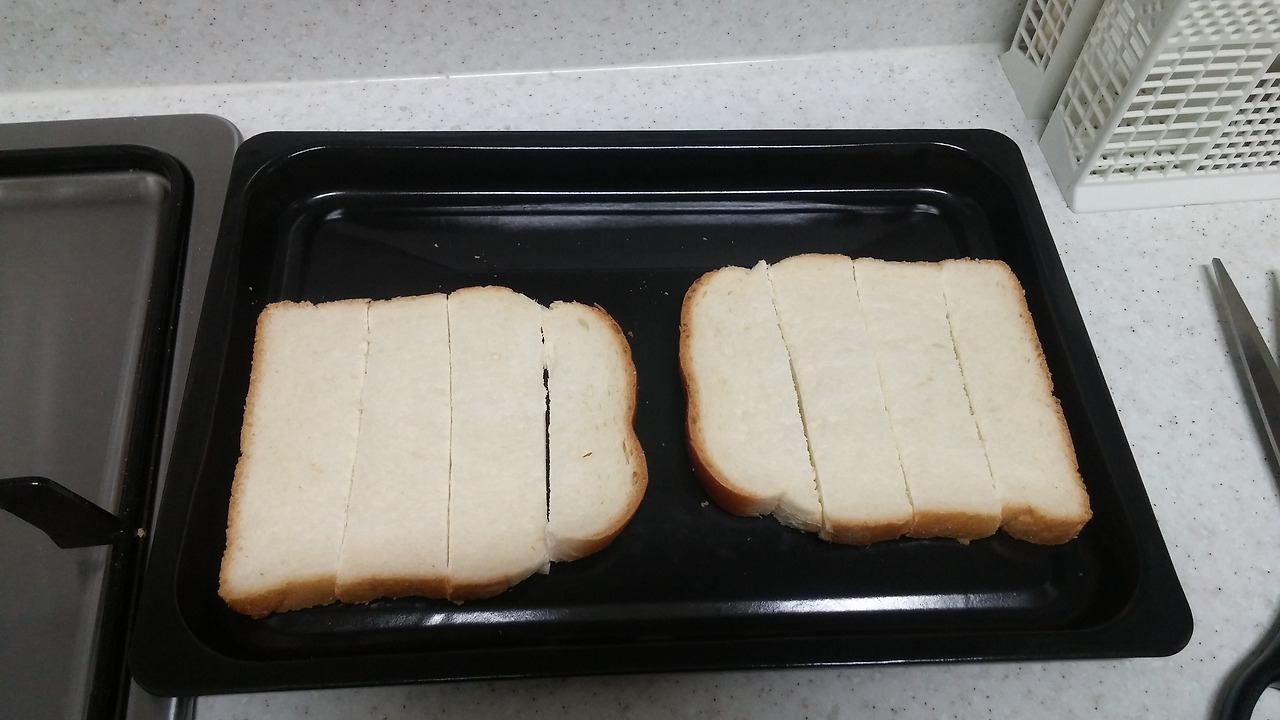 오븐 팬에 식빵을 원하는 대로 잘라서 올려줍니다.