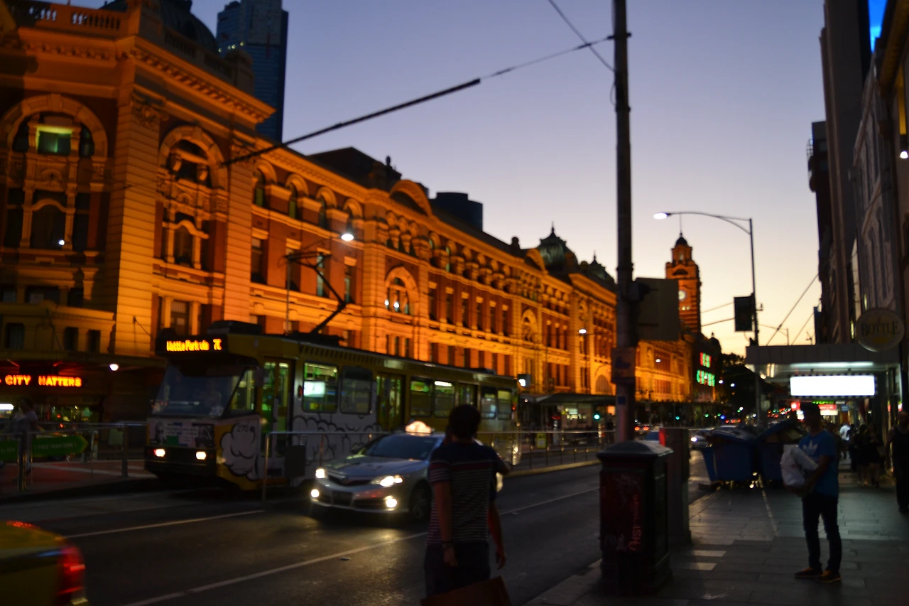 플린더스 스트릿 역, 해질 때 쯤 보니까 진짜 이뻤다. 타운홀에 레이저로 영상을 보여주는 걸 보고 크라운 호텔 앞에서 불쇼하는 걸 보고 들어왔는데 진짜 불이 날 것 같았다.